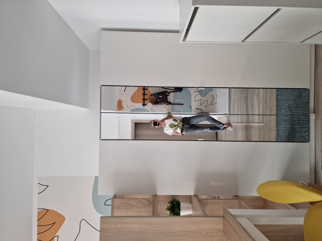 Gabi a propus integrarea unui dressing cu o lățime de 150 centimetri care să acopere necesarul de depozitare. Două dintre uși sunt placate cu oglindă, lucru care ajută la o mai bună distribuire a luminii naturale în interior. Sub panoul electric, și-a găsit locul un mic pantofar, suspendat pe perete, care servește și ca suport de chei sau alte mărunțișuri. Pentru hainele de exterior, Gabi a venit cu soluția unui cuier metalic, agățat după ușa de la intrare. Ca să protejeze peretele, a îmbrăcat porțiunea respectivă cu un tapet colorat care se reia apoi și în dreptul canapelei.
