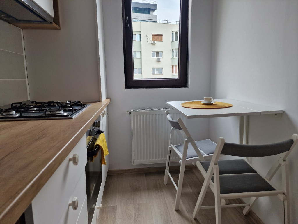 Bucătăria are 6 metri pătrați și o lățime de 180 centimetri. Dimensiunile încăperii au limitat considerabil posibilitățile de mobilare. Cu toate astea, Gabi a reușit să facă loc și pentru o masă cu două scaune pliabile, folosite doar la nevoie.