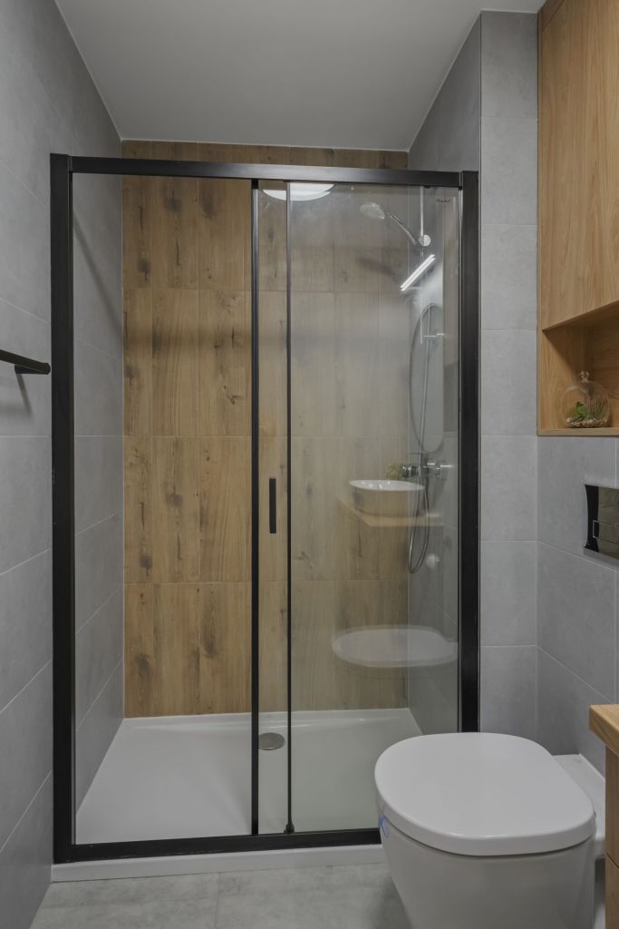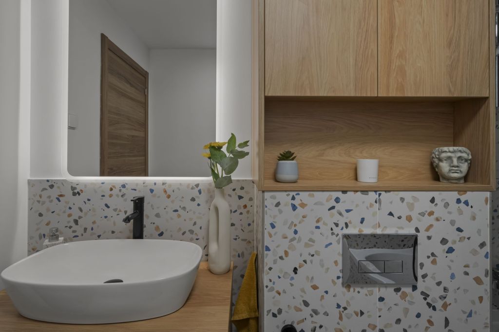 Baia principală urmează aceeași linie de design, îmbinând verdele intens cu modelul Terrazzo pentru un rezultat jucăuș, dar rafinat. „Am dorit să oferim spațiului o notă jucăușă și plină de energie”, explică Raluca. Plăcile ceramice, alese din gama Romstal, se combină armonios cu accentele din lemn.