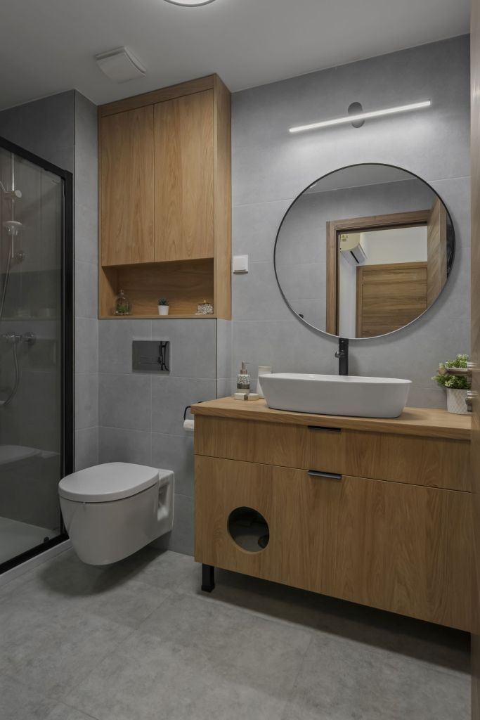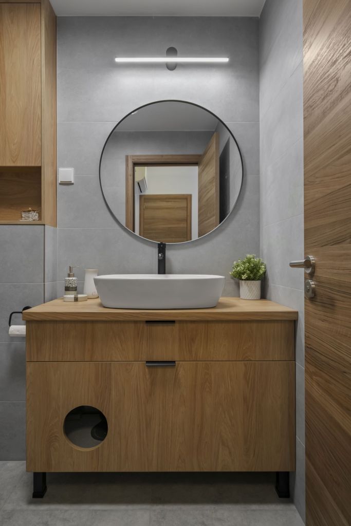 Cea de-a doua baie ascunde însă un detaliu ingenios: un sertar special integrat în mobilierul de sub chiuvetă, care servește drept ascunzătoare pentru pisica familiei. „Acolo se află și locul litierei, care se poate curăța foarte ușor doar prin deschiderea sertaruluil”, spune designerul.
