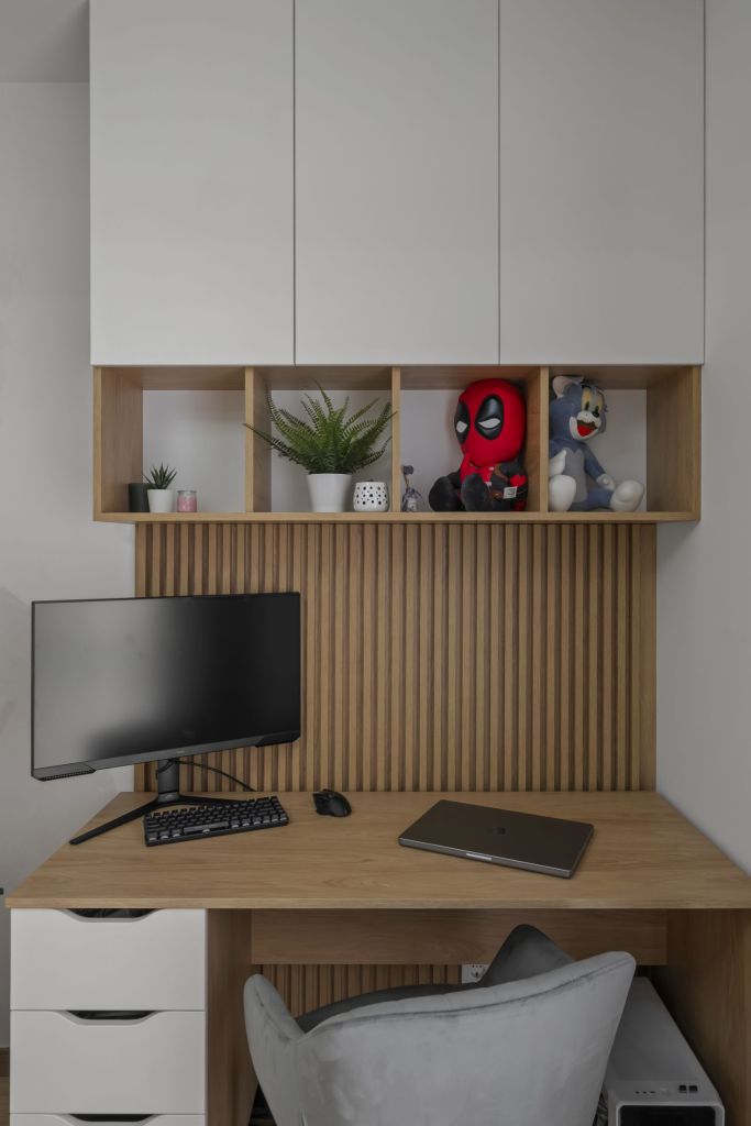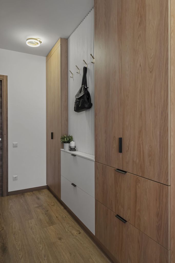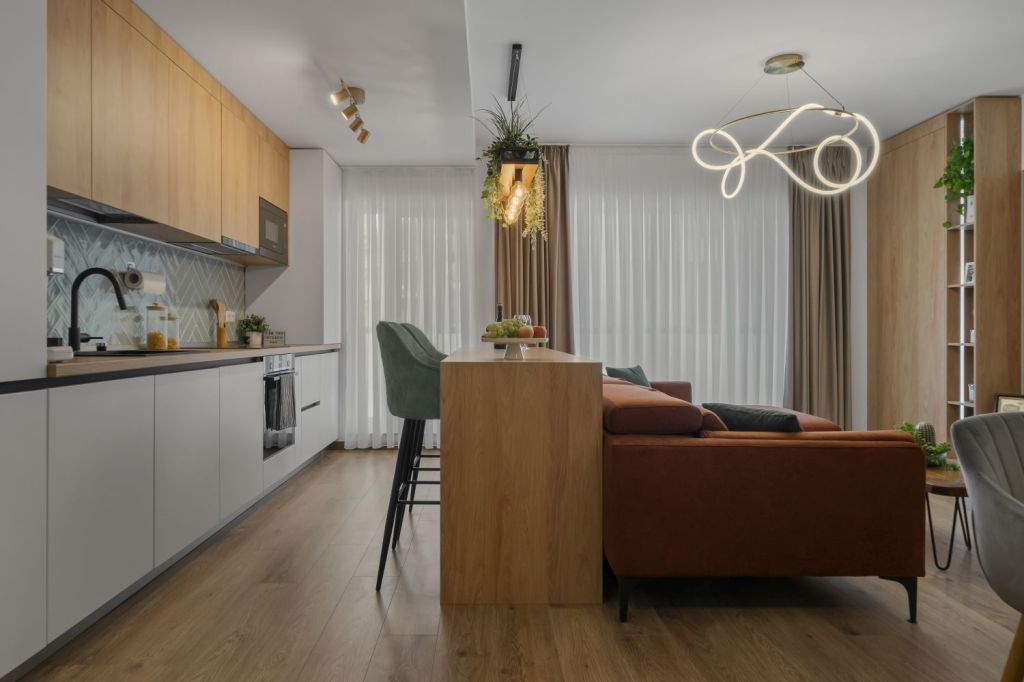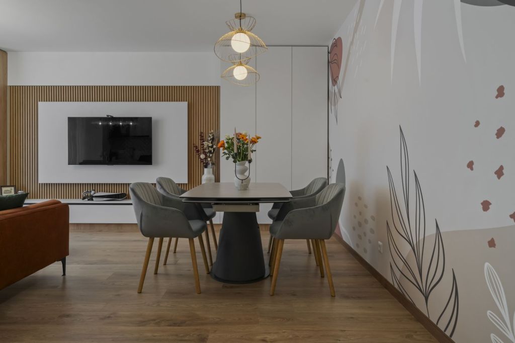 Interiorul păstrează o coerență vizuală între spații prin folosirea culorilor calde, a lemnului și a materialelor cu texturi fine. Tapetul cu imprimeu vegetal, chenarele decorative și corpurile de iluminat minimaliste definesc atmosfera calmă a apartamentului. Deși stilul este contemporan, notele cozy și detaliile vesele îl fac să se simtă ca un adevărat cămin.