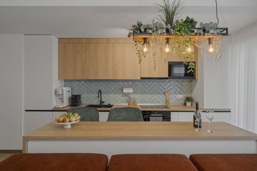 Bucătăria iese în evidență prin contrablatul verde dispus în model herringbone, o alegere care oferă dinamism vizual spațiului și creează un punct de interes pentru privitori. Deasupra insulei, un aranjament natural de plante creează o legătură subtilă cu exteriorul, aducând în interior un strop de natură autentică.
