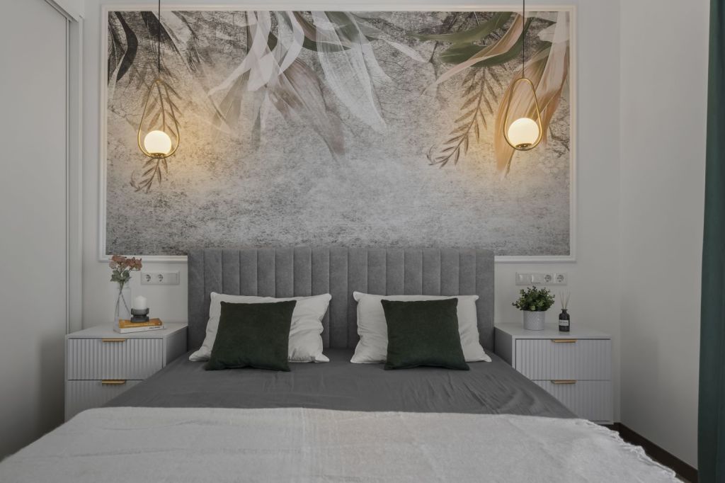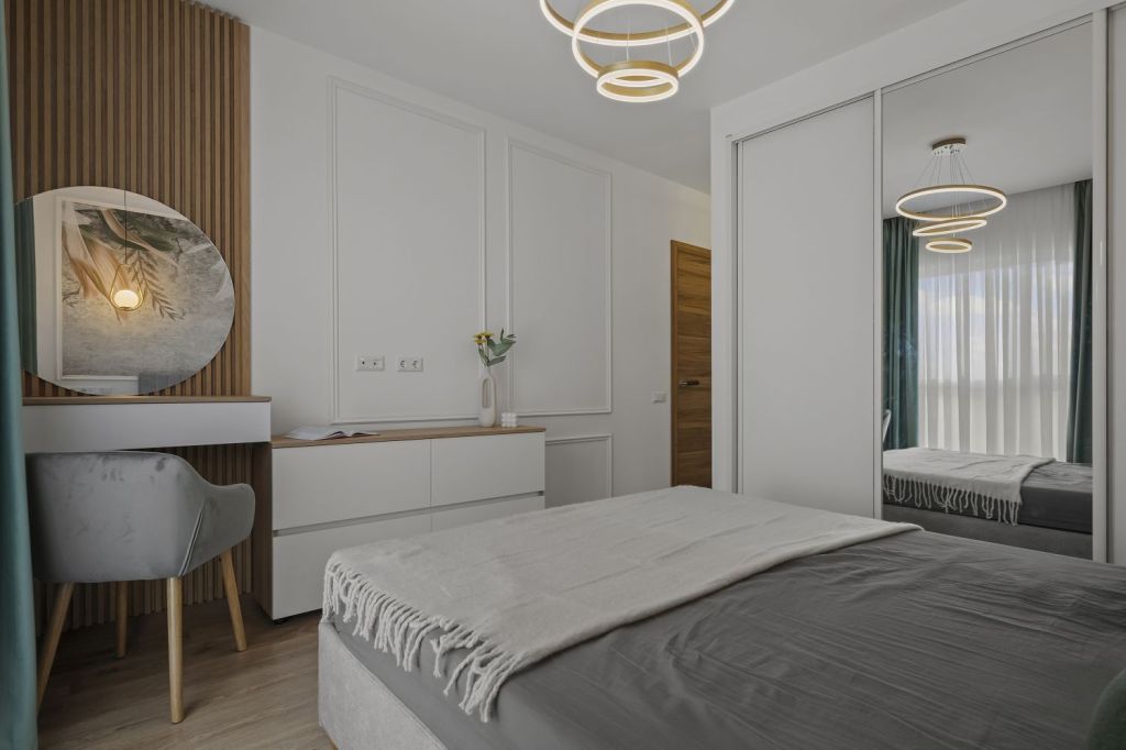 Dormitorul matrimonial este gândit ca o oază de liniște, în care nuanțele neutre și texturile naturale se îmbină armonios. Patul tapițat în gri deschis este pus în valoare de peretele de accent cu tapet vegetal, iar lumina caldă a corpurilor suspendate adaugă profunzime și confort vizual. „Corpurile de iluminat suspendate, cu design minimalist și lumina lor caldă, creează o atmosferă intimă și relaxantă”, spune designerul.