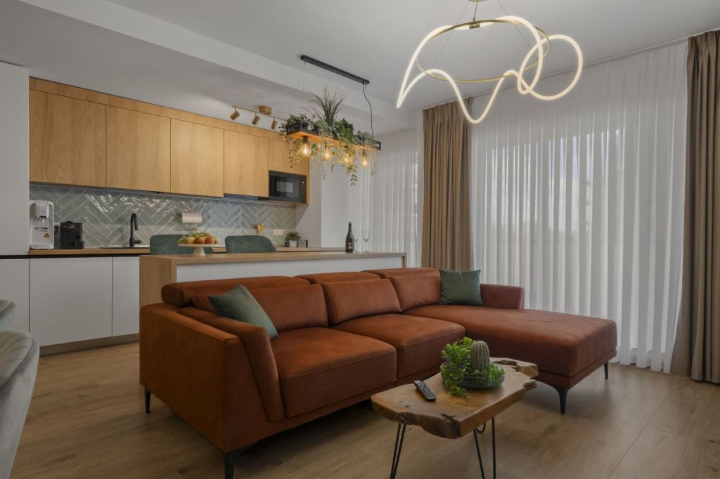 Zona de zi, un open space care integrează livingul, bucătăria și holul de intrare, este dominată de lumina naturală și de accentele calde ale mobilierului din lemn. Piesa centrală a livingului este canapeaua cărămizie, amplasată strategic pentru a delimita vizual spațiul și a aduce o notă de vitalitate.