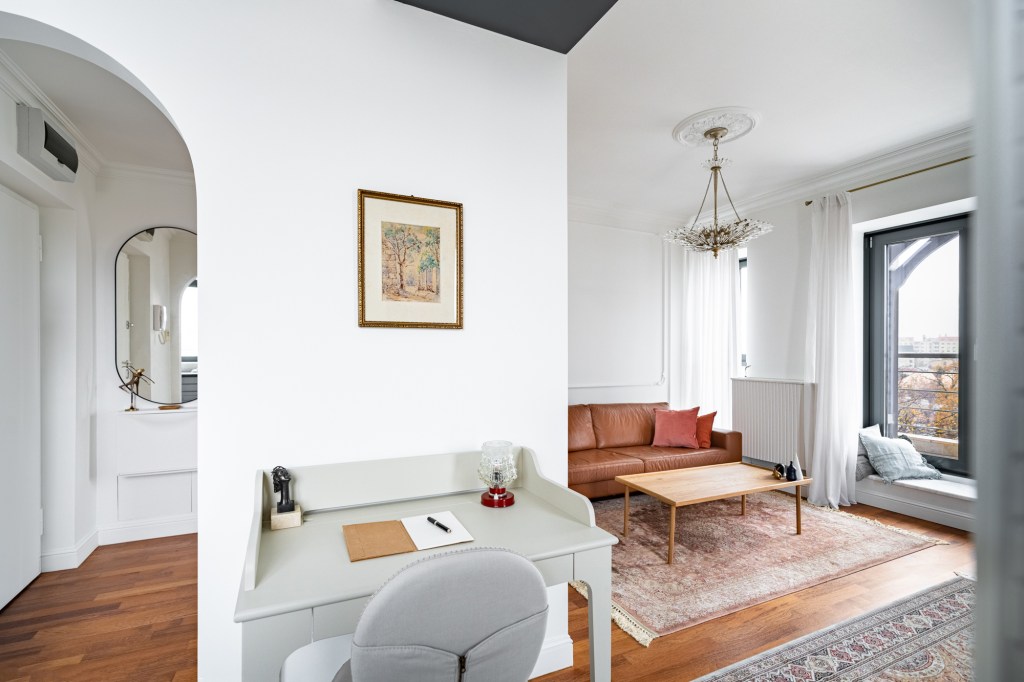 Karin și Alex, doi tineri pasionanți de design interior, au transformat un apartament dintr-un bloc nou din București într-o locuință elegantă, cu aer parizian. Detaliile decorative și mobilierul ales îți dau impresia că te afli într-un loc încărcat de istorie, nicidecum într-o clădire construită în 2010. Au amenajat în etape, pe parcursul mai multor ani și a costat în jur de 29.000 euro.