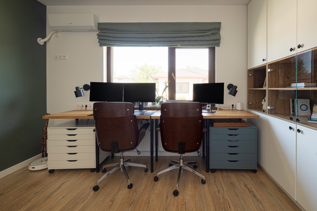 Beneficiarii, doi tineri care lucrează în IT, și-au dorit o amenajare care să integreze toate pasiunile lor: gătitul, timpul petrecut în familie, plantele verzi. Au apelat la arhitecta Anda Toma (Vlăstar Interiors) care i-a ajutat nu doar să găsească estetica potrivită, ci și să organizeze spațiul în funcție de nevoile lor. Casa este desfășurată pe parter, având o suprafață utilă de 112 metri pătrați. Este compusă dintr-un hol generos la intrare, open space care include bucătărie, dining și living, camera fetei, birou, dormitor matrimonial cu dressing deschis și două băi.