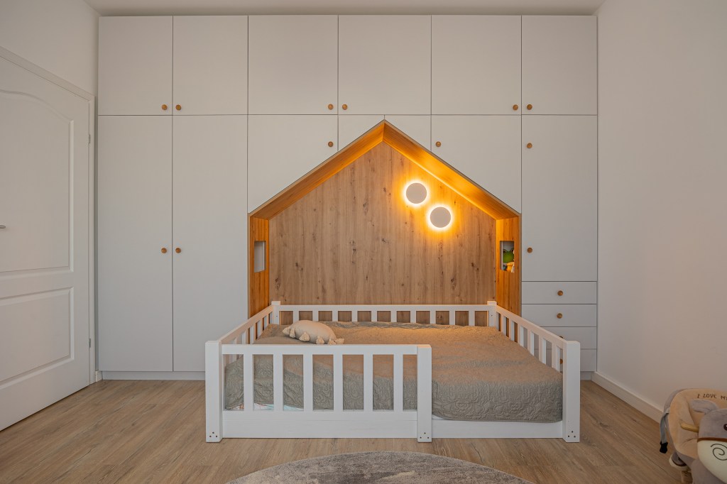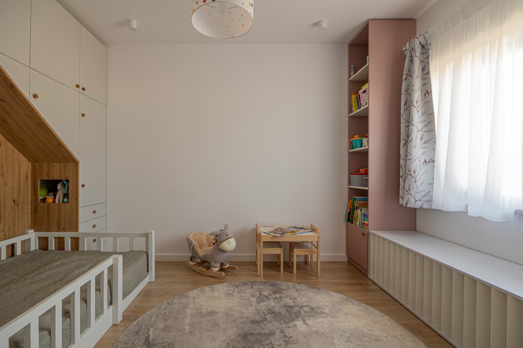 Camera fetiței este un exemplu de gestionare a spațiului pentru că integrează soluții de depozitare care se contopesc cu decorul. Mijlocul încăperii este lăsat liber pentru mai mult loc de joacă, iar patul Montessori sub formă de căsuță este opțiunea perfectă pentru un copil de trei ani.