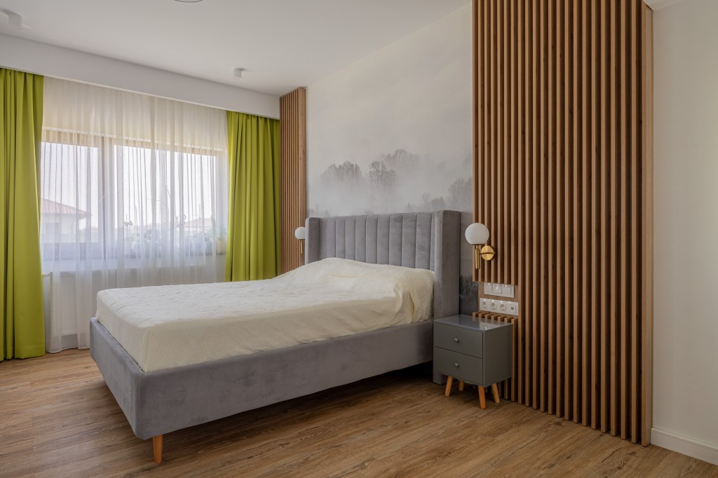 Dormitorul matrimonial este un spațiu elegant și odihnitor. Din punct de vedere cromatic, Anda a continuat aici linia generală a proiectului, combinând tonuri discrete de gri cu accente de verde citron. Încăperea este aerisită, lucru accentuat și de mobilierul cu picioare. Atmosfera caldă este sugerată și de tapetul discret de la XTDeco.