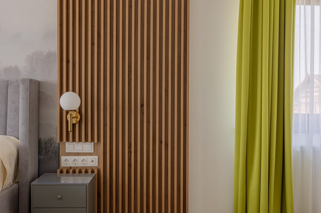 „Întotdeauna, implementarea din șantier este o provocare”, spune Anda. „De obicei, când ajungem în acest punct al proiectului, avem o idee foarte clară despre cum vor fi detaliile și atunci când realitatea ne spune subtil că are și ea niște idei (diferite, bineînțeles) ne punem la masă/birou și începem să căutăm soluții. Aici, am avut o situație mai complicată în dormitorul matrimonial. Beneficiarii, Mady și Armand și-au dorit un pat cât mai confortabil. Am ales un model destul de lat, așa că am fost cam la limită cu spațiul pe care l-am lăsat între prize”.