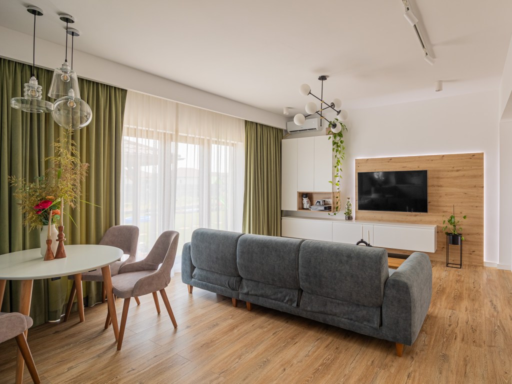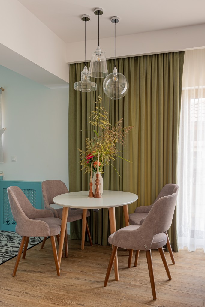 Zona de dining delimitează vizual bucătăria de living. Masa rotundă se potrivește bine în layout-ul propus de Anda, pentru că oferă mai multă libertate de mișcare. Este un spațiu pus în evidență de cele trei lustre suspendate, cu abajur din sticlă transparentă. În zona de living, mobilierul este minimal, accentul fiind pus, mai ales, pe confort. De altfel, canapeaua, achiziționată de la Mobila Dalin, este cea mai scumpă piesă de mobilier folosită în amenajare, exceptând, desigur, soluțiile custom-made. Încăperea se bucură de multă lumină naturală, ceea ce face ca spațiul să fie mai primitor. Ajută mult și verdele draperiilor, dar și prezența plantelor naturale.