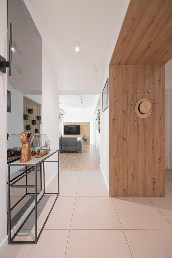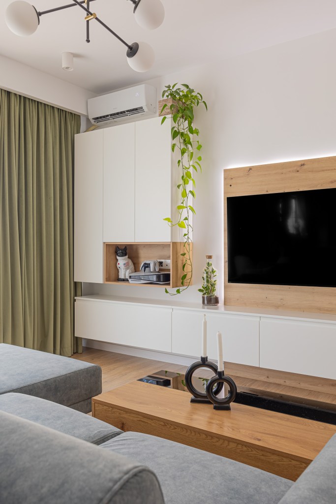 Proiectul a fost preluat când pereții erau încă la roșu. Toate finisajele din casă au fost realizate de dezvoltator, sub îndrumarea Andei. Un plus al locuinței a fost compartimentarea spațiului care a permis crearea de zone cu funcționalități bine definite, dar și ușor de accesat. Era nevoie de un interior cât mai practic, spune arhitecta care s-a ocupat de amenajare, având în vedere componența familiei: doi adulți, un copil și două pisici.