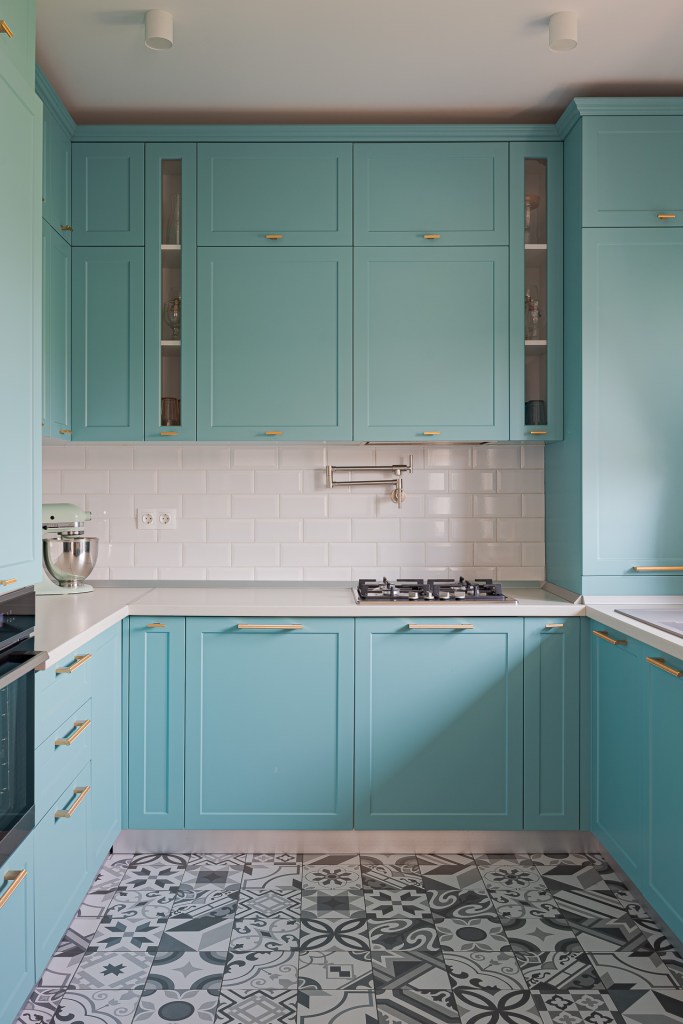 În ceea ce privește mobilierul, Mady și-a dorit să aibă cât mai mult spațiu de depozitare. Anda a venit cu ideea corpurilor închise, înalte până în tavan, cu mici inserții vitrate care să aducă un plus la nivel estetic. Desigur, turcoazul mobilierului este cel care face ca spațiul să fie cu adevărat, vibrant. Un amănunt haios în amenajarea bucătăriei: cromatica a fost aleasă în funcție de mixerul de la Kitchen Aid, un obiect pe care Mady îl adoră și care are locul lui special pe blat.