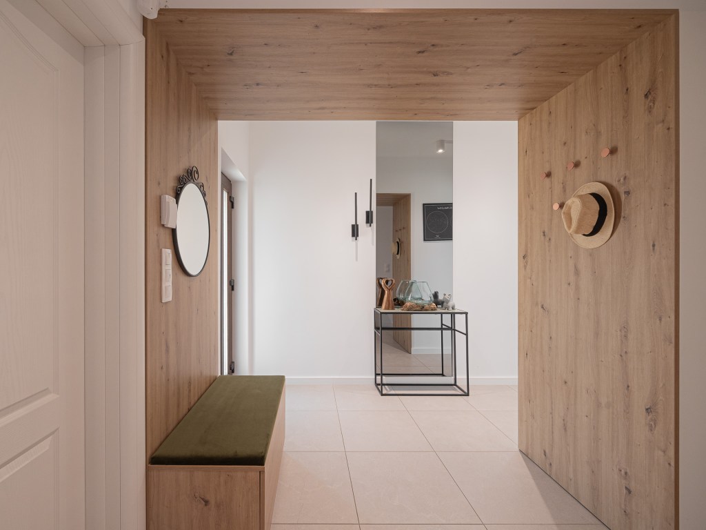 Delimitările dintre o zonă și alta s-au făcut, în mare parte, cu ajutorul finisajelor, mai ales la nivel de pardoseală. În holul de la intrare, de exemplu, sunt plăci ceramice de mari dimensiuni. În bucătărie e gresie cu model patchwork, iar în rest, parchet laminat. Pentru a crea o legătură între spații, Anda s-a folosit de fundalul alb al pereților, de texturi și de accentele de culoare. Elementele din lemn sau imitație de lemn sunt alte detalii care au rolul de a da un aspect unitar amenjării și sunt prezente în întreaga casă, cu excepția bucătăriei.