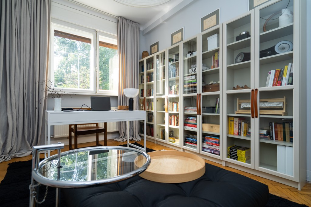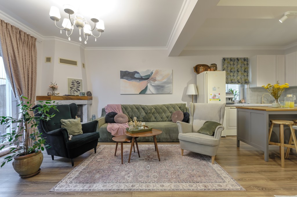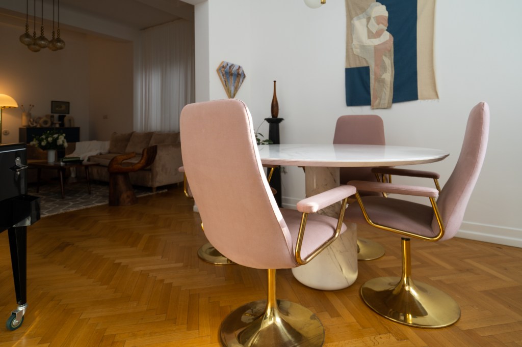 Cei 90 de metri pătrați sunt împărțiți în dining, living, birou, dormitor, bucătărie și baie. Din hol, intri în dining, unde te întâmpină o masa grandioasă din marmură de la Piatra Online. Urmează livingul, un spațiu generos în care Anna și prietenul ei își petrec serile alături de cele două pisici. Livingul comunică cu o altă cameră transformată în birou în perioada restricțiilor din primăvară. „În timpul carantinei, am simțit nevoia unui spațiu rezonabil de lucru și-am transformat camera asta în birou. Înainte era mai mult un spațiu de depozitare”, spune ea.