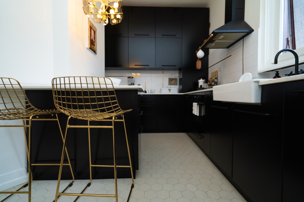 O bucătărie cu mobilier negru, dar foarte luminoasă