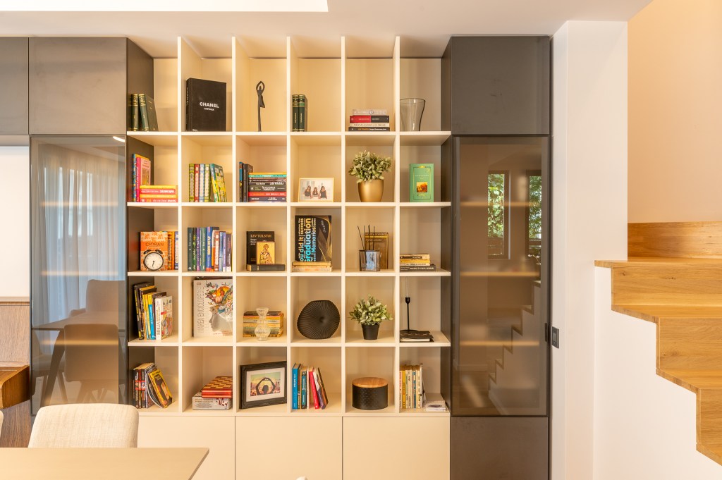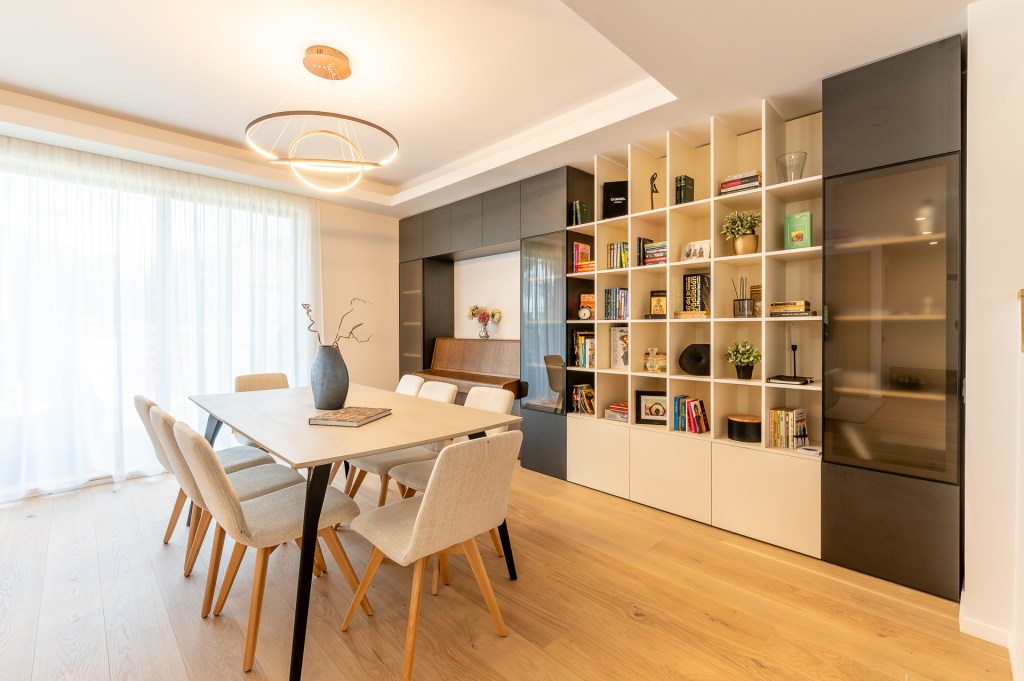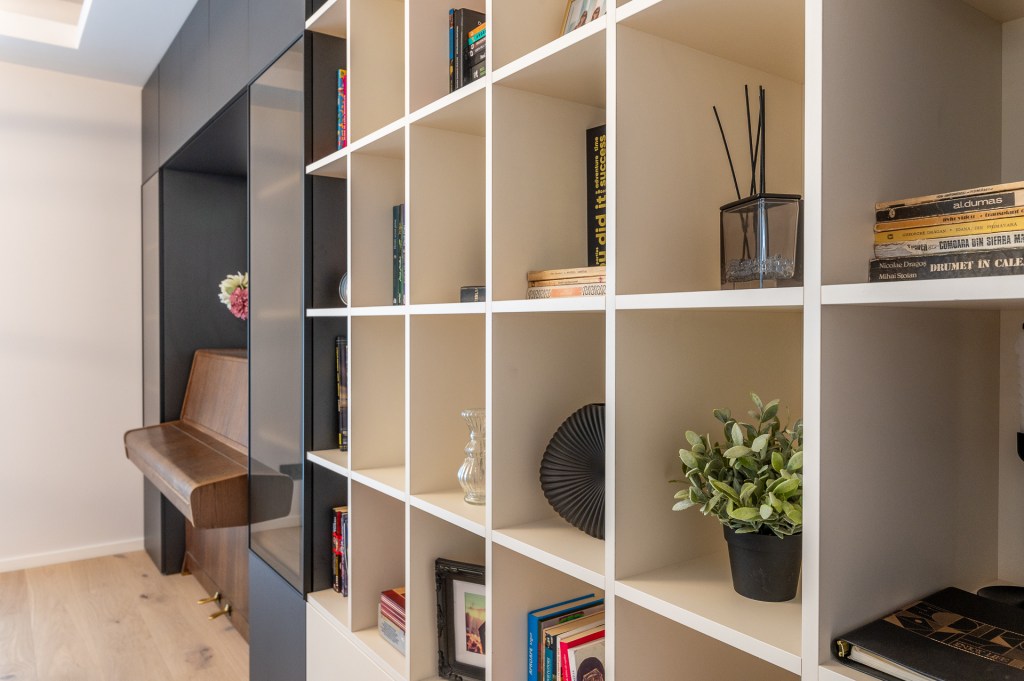 „Una dintre cerințele proprietarilor a fost să găsesc o soluție pentru a integra pianina în decorul livingului. Am proiectat mobilierul în jurul acestui element și cred că am reușit să îl armonizez cu restul amenajării”, spune designerul. „Biblioteca este făcută pe comandă și am alternat rafturile deschise cu corpuri închise de mobilier, pentru un aspect cât mai organizat al spațiului”.