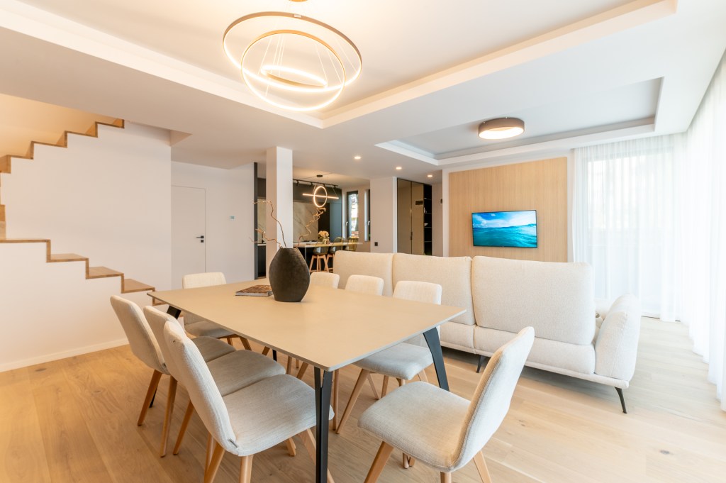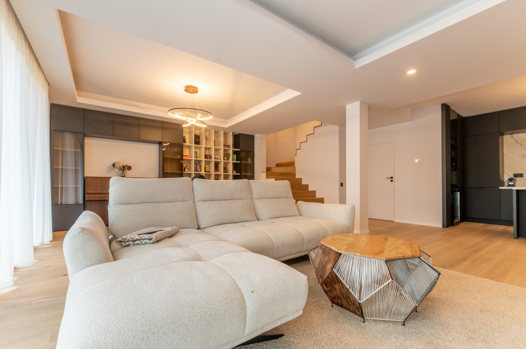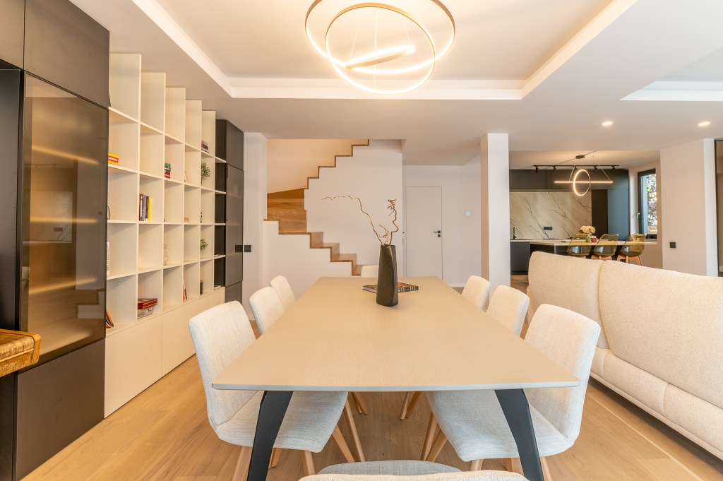 Livingul cuprinde două zone principale: un spațiu destinat relaxării, cu canapea, zonă media și masă pentru opt persoane. Amenajarea e una aerisită, cu accent pe calitatea finisajelor, texturi și pe cromatica în tonuri neutre. Ca să spargă monotonia, Luisa a folosit accente de negru. Cel mai bun exemplu în acest sens este biblioteca cu geamuri fumurii, făcută pe comandă. În aceeași idee însă funcționează și corpurile de iluminat sau piesele de mobilier cu picioare metalice. Un element central în amenajarea open space-ului este scara interioară, care continuă liniile curate ale proiectului prin renunțarea la balustradă, sugestie venită de la proprietari.