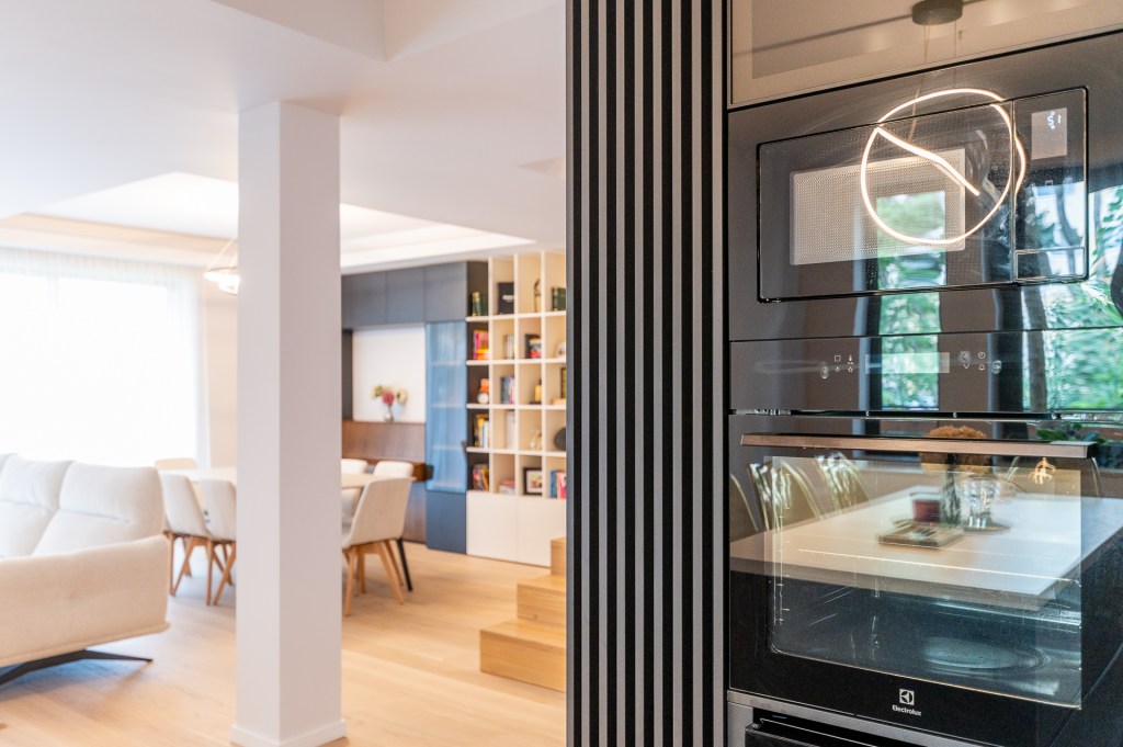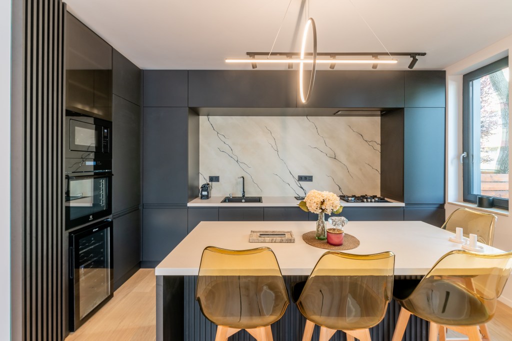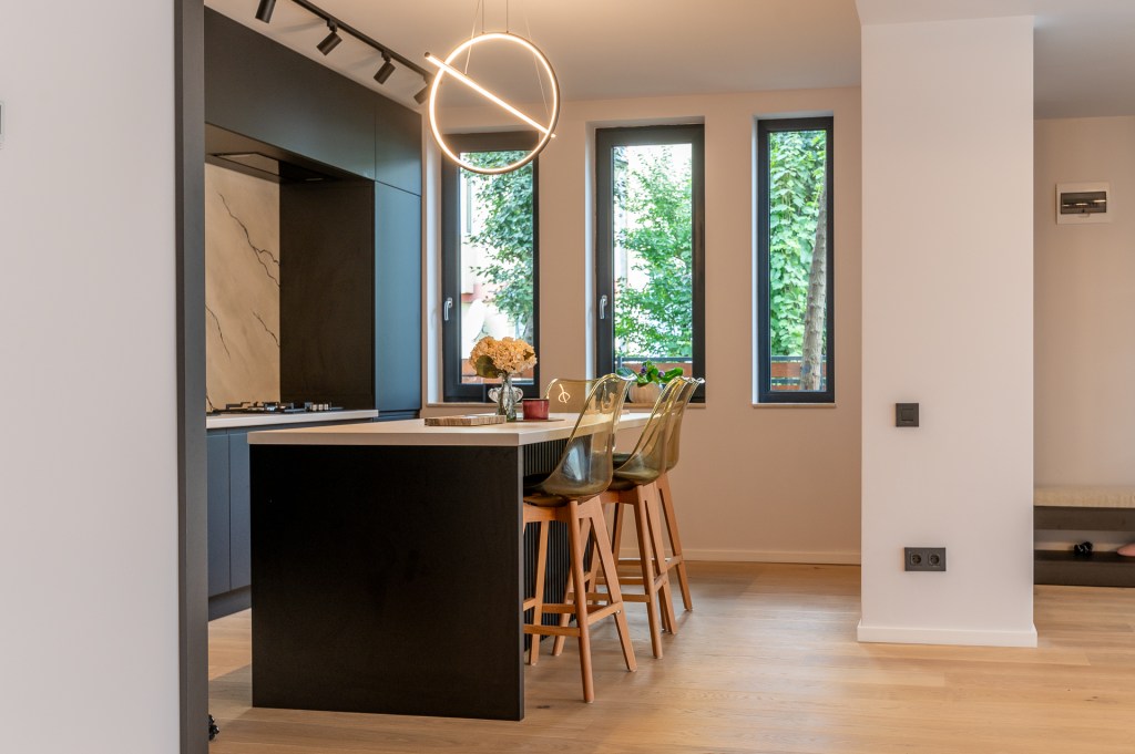 Bucătăria este inima casei, iar configurația mobilierului ajută din plin. În mijlocul încăperii e masa tip insulă în jurul căreia se adună toată familia. Pe lângă culoarea mobilierului, care atrage atenția fără să încarce, alte mici trucuri fac încăperea să fie modernă și aerisită: electrocasnicele incorporabile, absența mânerelor, corpurile de mobilier înalte până în tavan.