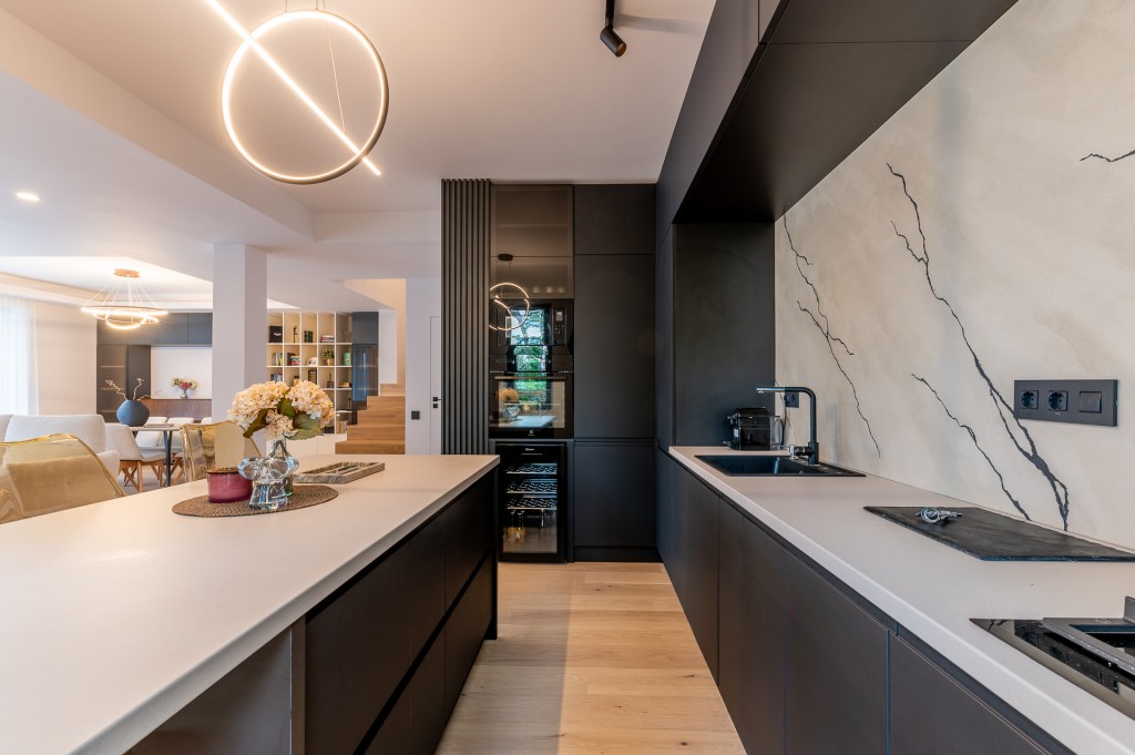 „Backsplash-ul extins, realizat manual, imită prin finisajul său o piatrã cu nervuri negre. Este realizat cu multă migală de cei de la Pasabo. Acesta este, fără îndoială, elementul care captează toată atenția în bucătărie”, spune Luisa. „Ne-a ajutat mult și hota de plafon Pando care a putut fi montată la distanță mare față de plită. În felul acesta, am reușit să punem și mai bine în valoare frumusețea contrablatului”.