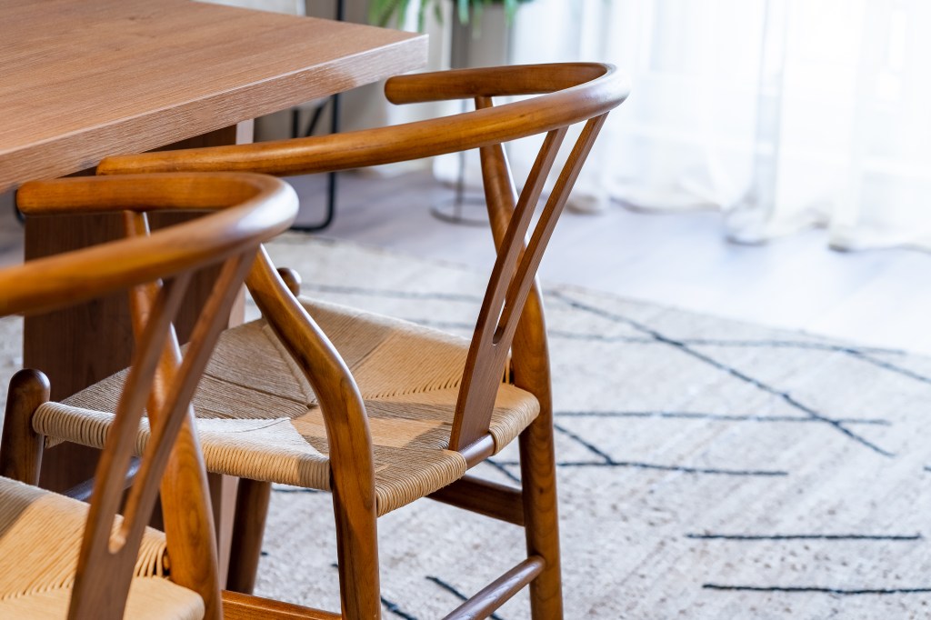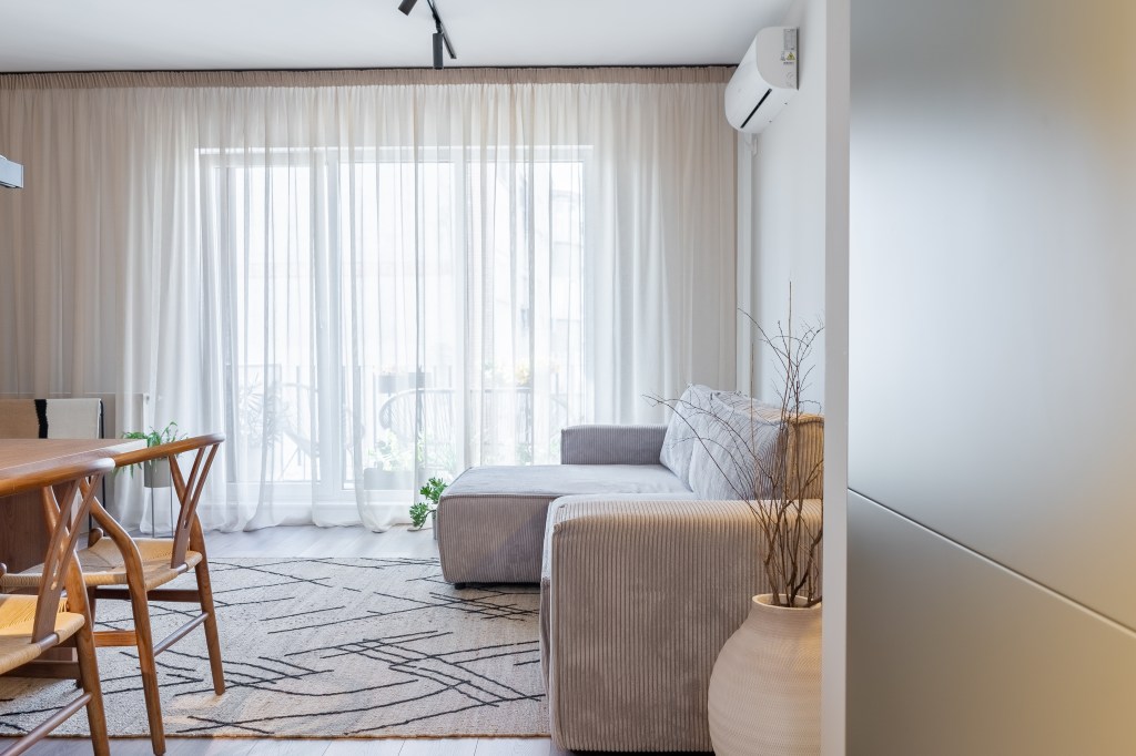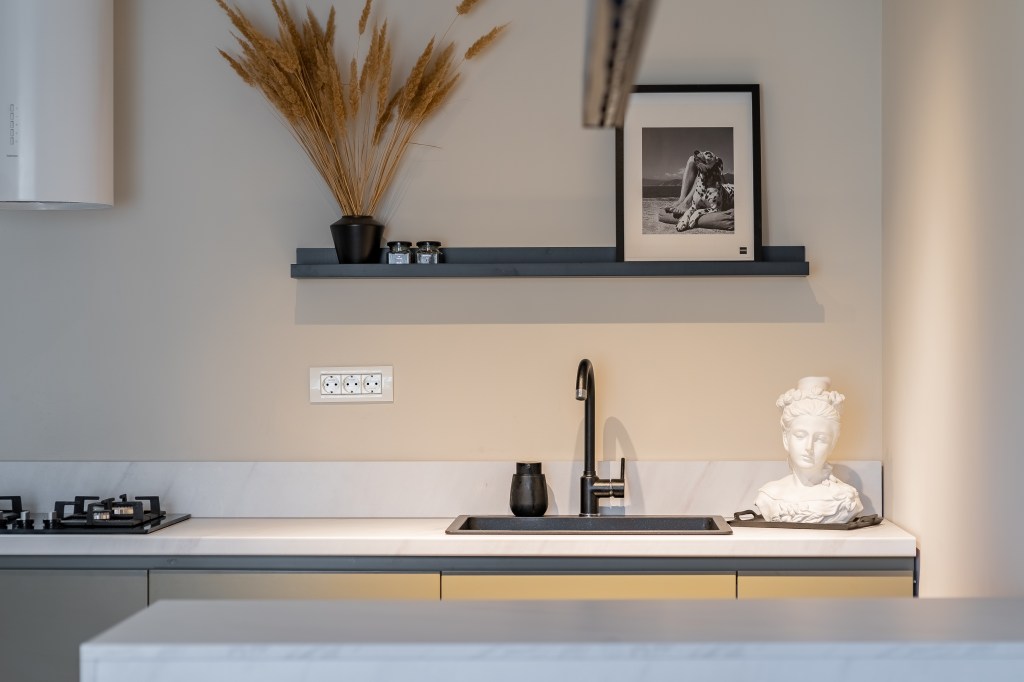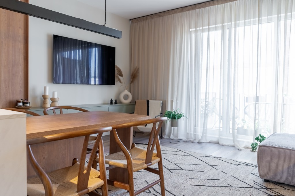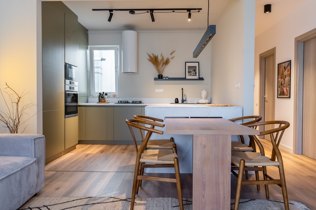 În jurul insulei și a mesei se desfășoară bucătăria, organizată în formă de „L”, cu toate electrocasnicele mari incorporate în mobilier, și livingul. Acesta din urmă vine în completare prin nuanțe neutre de bej și gri, cu un colțar încăpător și draperii care se desfășoară pe întreg peretele și permit luminii naturale să-și facă de cap.