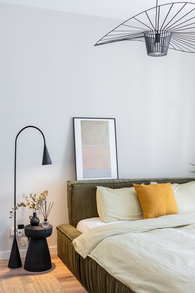Dormitorul are o amenajare simplă, care-i permite să rămână un spațiu strict pentru somn și relaxare, care să nu stimuleze vizual excesiv. Patul e făcut pe comandă și el, în nuanțe similare mobilierului de bucătărie. În jurul lui sunt câteva piese cu design foarte simplu, dar de efect.