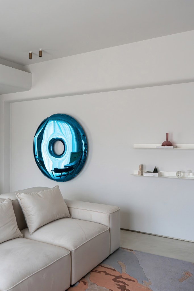 Obiectele decorative și accentele cromatice puternice au transformat complet vibe-ul interiorului. Fotoliul de la Cassina este una dintre vedetele amenajării. La fel și oglinda Rondo de la Zieta, într-un finisaj cromat turcoaz. Pentru a lega vizual zona de living cu diningul, Daniela și Alexandra au propus confecționarea pe comandă a unor măsuțe de cafea aurii, ca o trimitere la alama care personalizează insula.