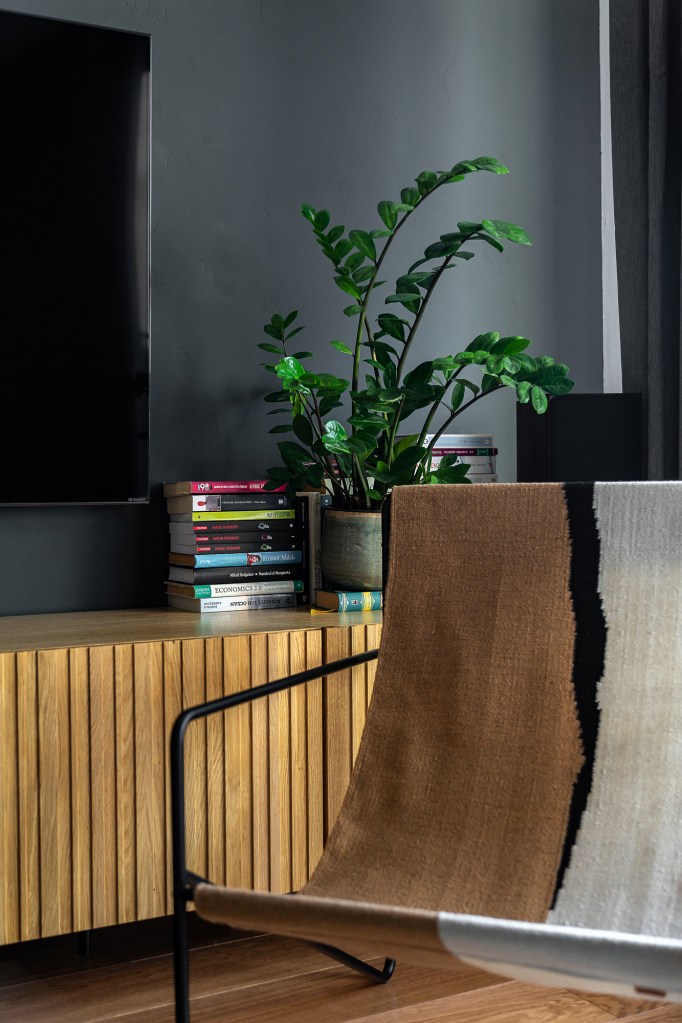 „Pentru peretele din fața canapelei, în contrast cu cel din spatele ei care are rolul de a prezenta printurile de artă, am ales tot o tencuială de la IR Colours, cu aspect rugos”, explică Alexandra. „Culoarea închisă pune în evidență lemnul, plantele și obiectele decorative de pe comodă”.