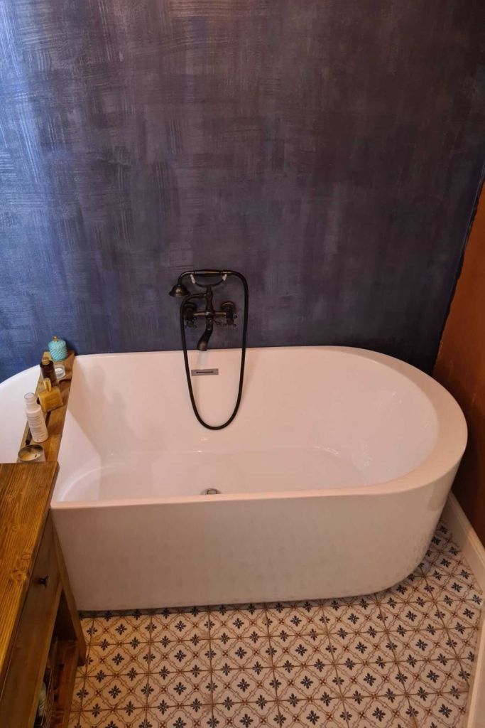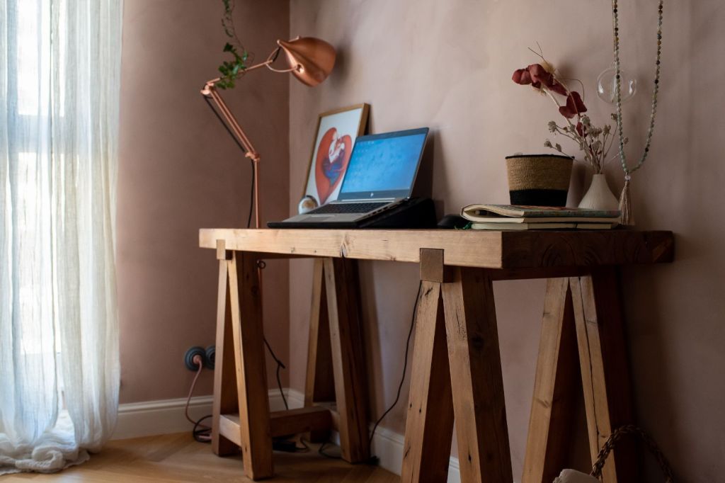 Alexandra și-a dorit tare mult câteva obiecte speciale în amenajare, iar unul dintre ele este chiar biroul din living, cu model de picioare în V întors, realizat din lemn vechi de stejar. Inițial l-au văzut pe Instagram, apoi l-au făcut pe comandă la Slender Tree și a costat 1.200 euro. Cada freestanding și vopseaua din baie, în detrimentul faianței, s-au enumerat și ele printre plăcerile vinovate.