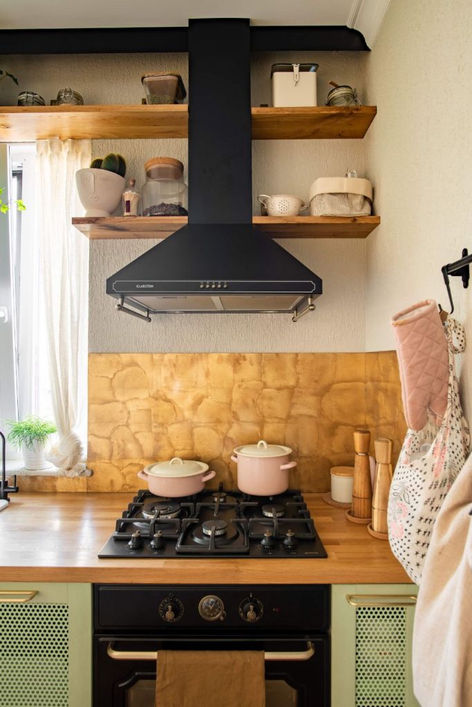 În bucătărie nuanțele neutre sunt combinate cu detalii negre și aurii.