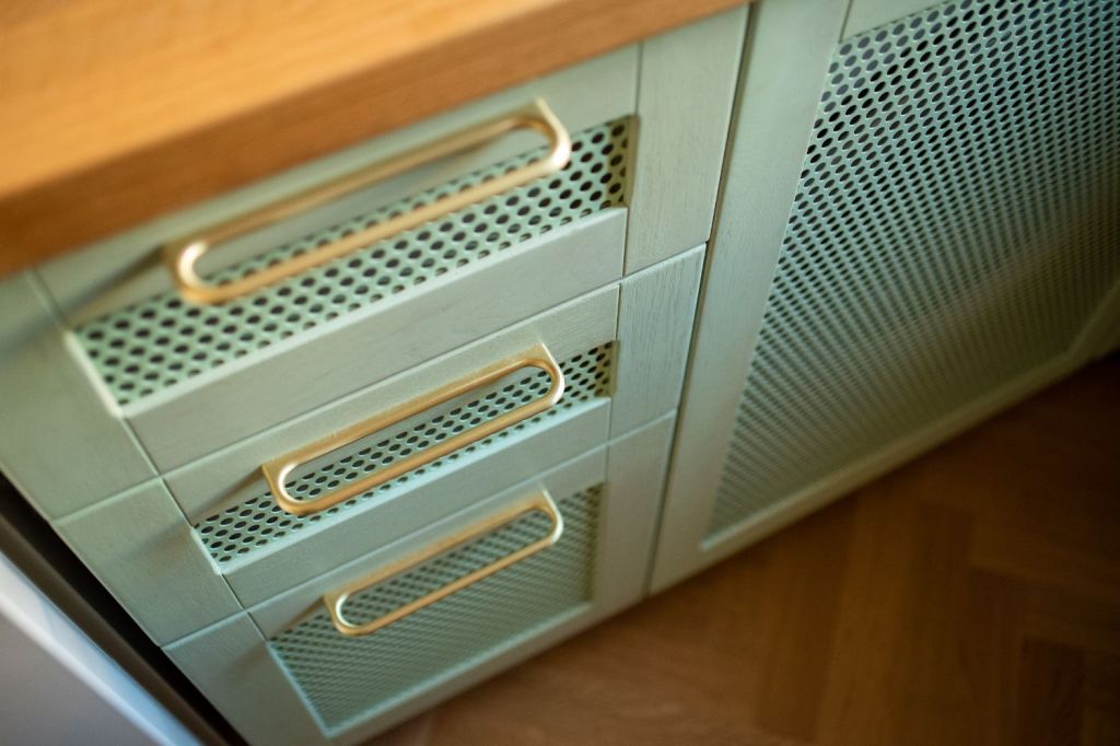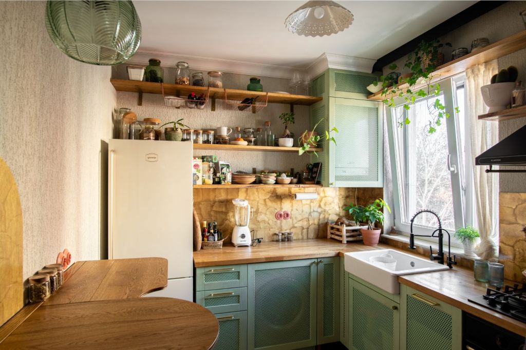 Bucătăria este o încăpere separată de living, așa cum proprietara își dorea de la bun început. Aici au reușit să integreze un mobilier impecabil estetic, dar și funcțional, mașina de spălat rufe și o măsuță de tip bar, rabatabilă, pentru momentele de dans în timp ce se gătește. Paleta cromatică este una neutră, cu mici accente de culoare oferite de verdele mentă al mobilierului și lemnul folosit pentru blat, polițe și măsuță.