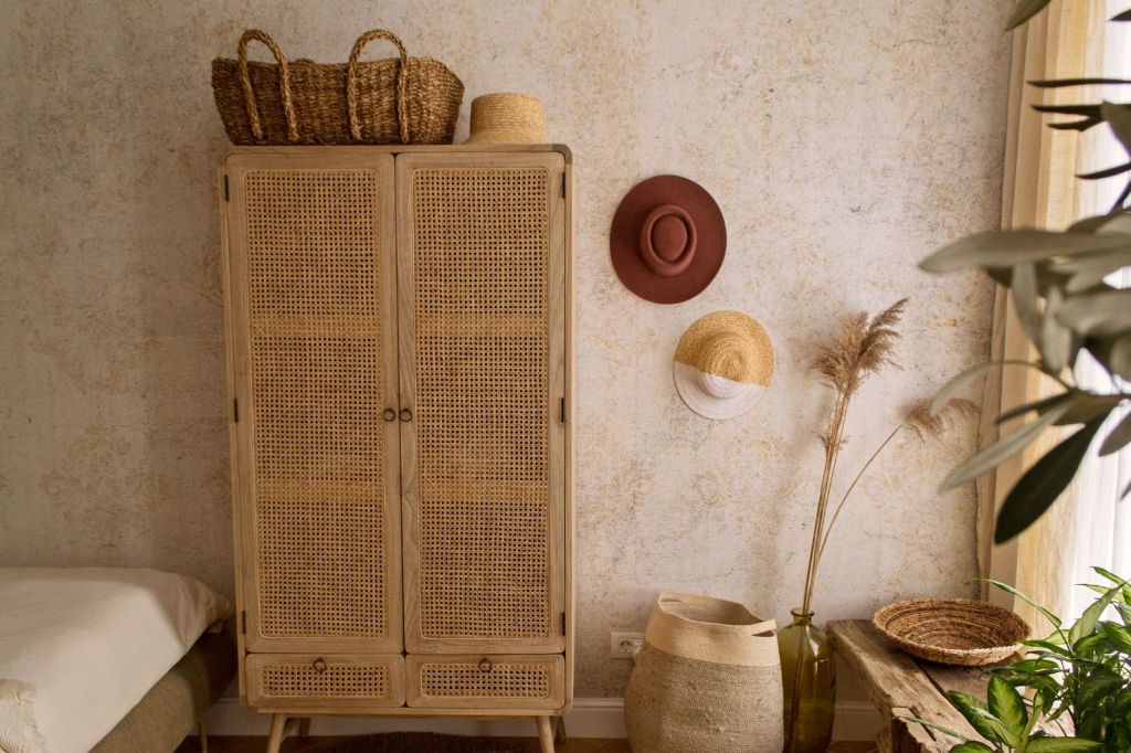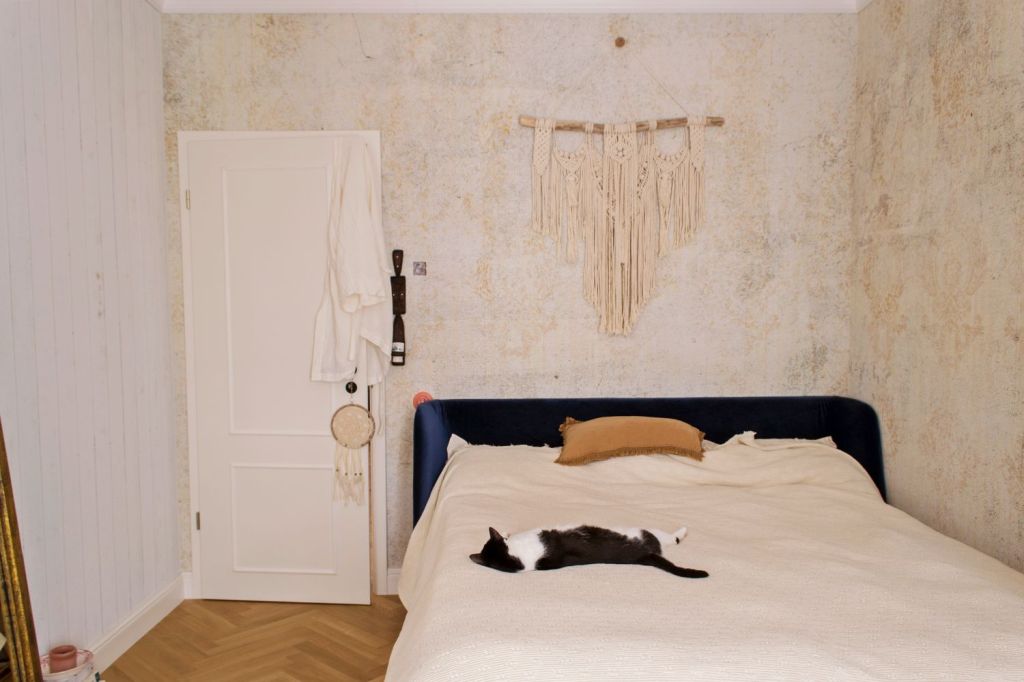 Dormitorul are 14,5 metri pătrați și, pentru că au poziționat depozitarea principală în living, au reușit să păstreze un spațiu aerisit, potrivit pentru odihnă. Cromatica este una natur, compusă din alb, bej și mult lemn, deoarece Alexandra și-a dorit să fie o cameră care o duce cu gândul la o vacanță în Grecia.