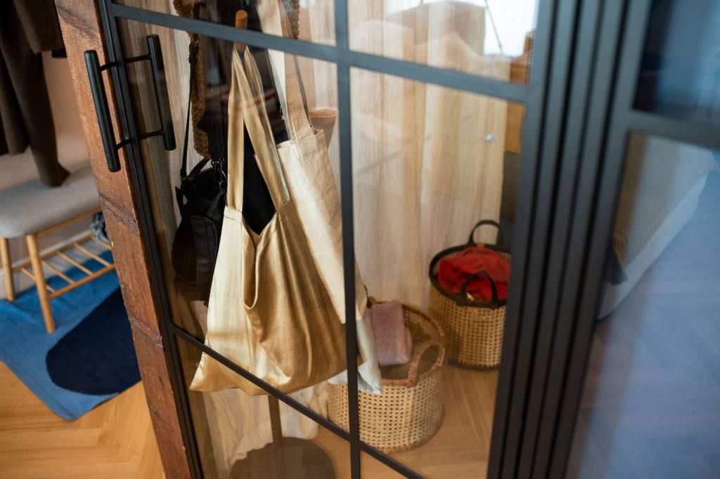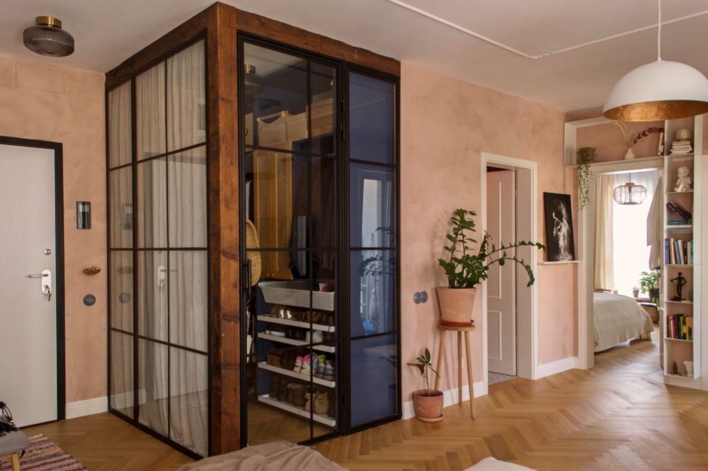 „Am reușit să facem – custom made – chiar un dressing generos, walk-in, din sticlă securizată și metal, cu stâlpi solizi din lemn vechi. Astfel, acesta a devenit un element wow al amenajării de cum intri în casă – atrage priviri fără a fi ostentativ, pentru că în spatele sticlei stau subtil și niște perdele fluide din in”, povestește Laura.