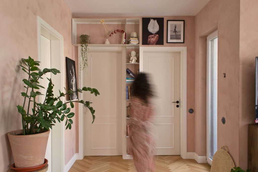 Culoarea piersică-rozie diafană, ieșită din varul natural de pe pereți, se completează perfect cu inserțiile masculine date de albastrul și negrul din canapea și dressing. Totuși, tușele de auriu-bronz și negru apar în aproape fiecare încăpere, tocmai pentru a puncta într-un mod rafinat cromatica aleasă.