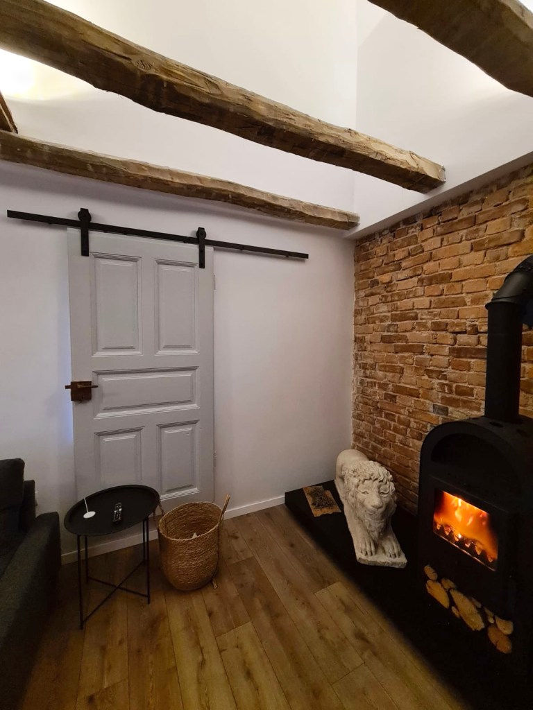 În zona de living, de exemplu, peretele original de cărămidă este folosit ca accent. La fel și grinzile descoperite care pe lângă rol funcțional, au și rol estetic, în această zonă spațiul dezvoltându-se pe două niveluri. O altă grindă veche de stejar este folosită ca suport TV. Ușile originale au fost folosite ca uși glisante între dormitor și dressing la etajul mansardat, iar în zona de zi, o astfel de ușă funcționează pe post de paravan la unul dintre geamuri. Din vechea amenajare, au mai fost recuperate o mașină de cusut, câteva mese și  câteva scaune. Fiecare dintre aceste obiecte cu poveste au fost recondiționate și folosite apoi în noul decor al casei.
