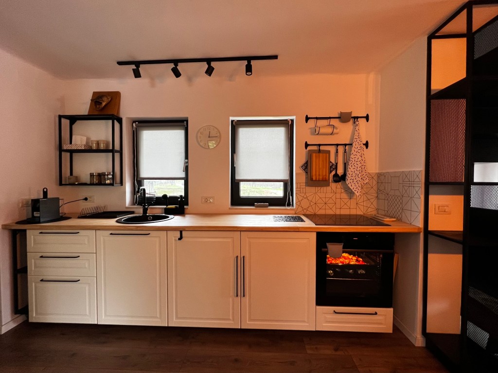 În interior, lucrările s-au concentrat pe recompartimentarea spațiului. Georgiana este arhitect, așa că a reușit să gândească încăperi funcționale care să comunice natural. În formula actuală, casa are la parter dormitor, baie, bucătărie cu zonă de dining și  living.