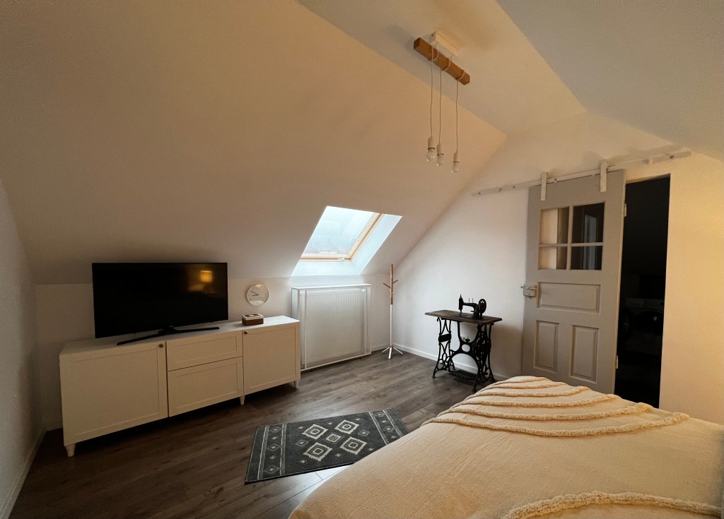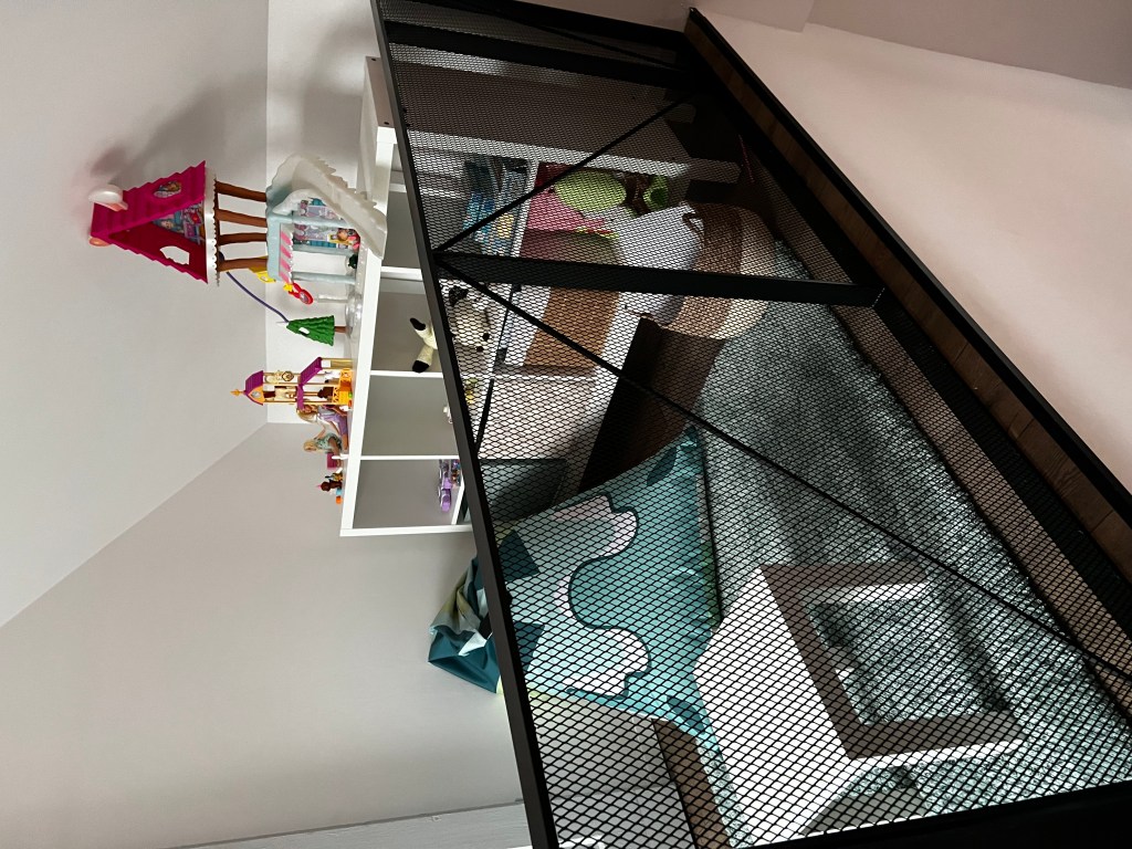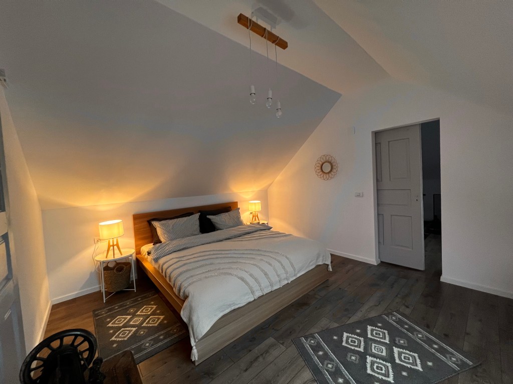 Accesul către mansardă se face printr-o scară metalică, fără balustradă