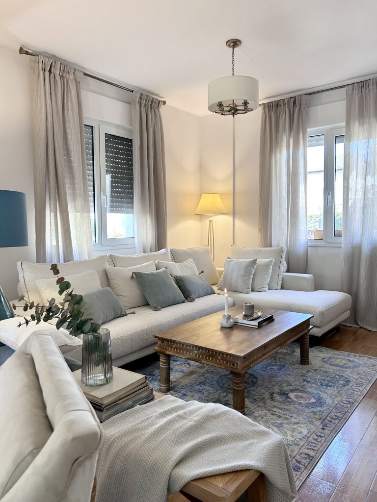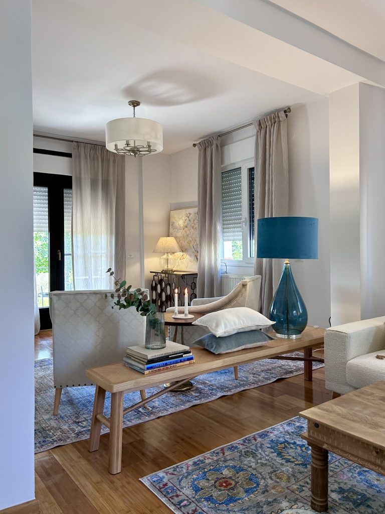 Întreaga amenajare este un mix de piese premium, cu obiecte de buget, această abordare fiind, de altfel, o semnătură a designerului. Nimic nu este ales întâmplător, de la textilele folosite, până la decorațiuni sau corpuri de iluminat. Corina nu a urmărit un stil anume. A încercat, mai degrabă, să obţină un decor actual și sustenabil, care să îşi mentină prospețimea peste ani.