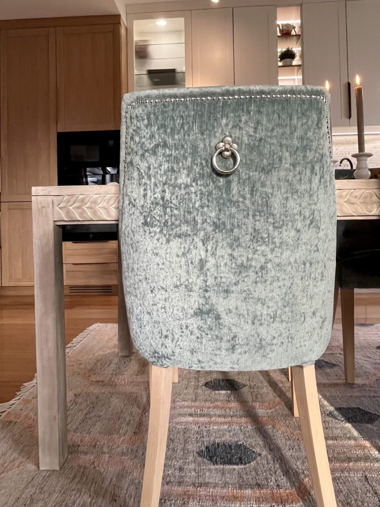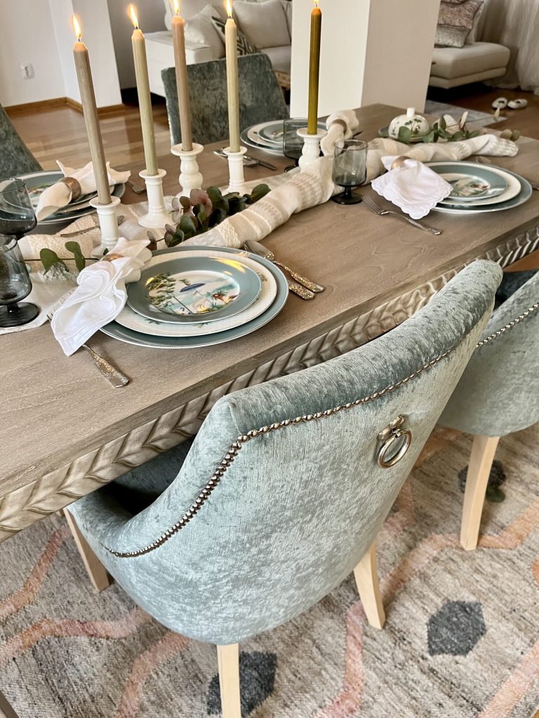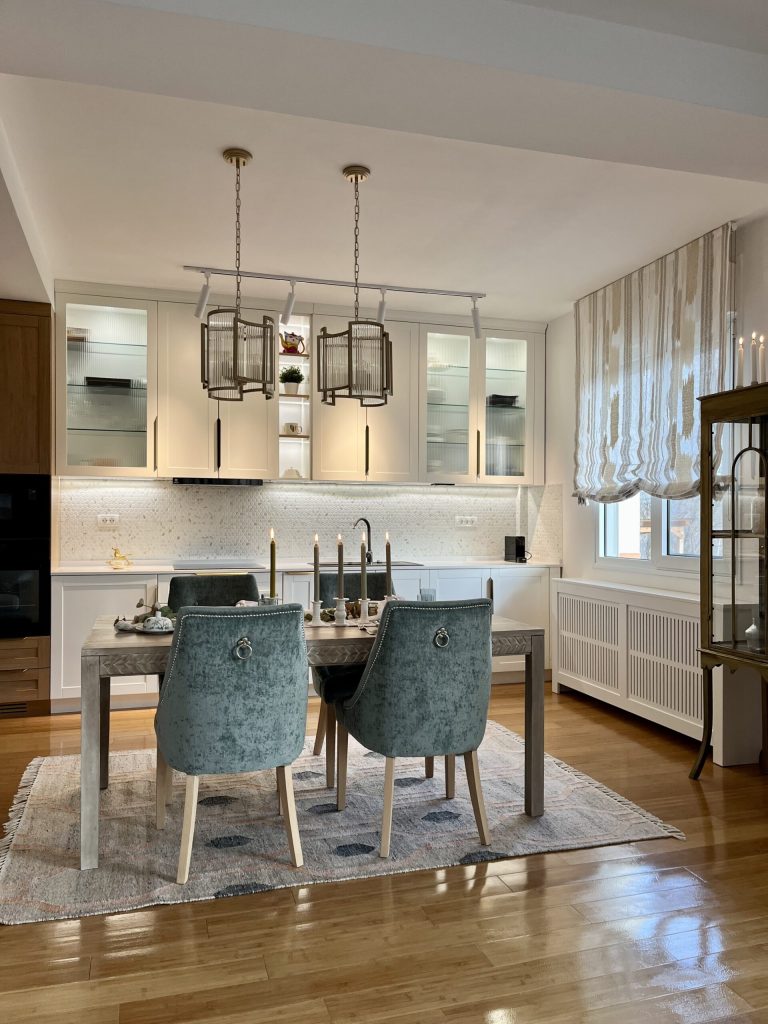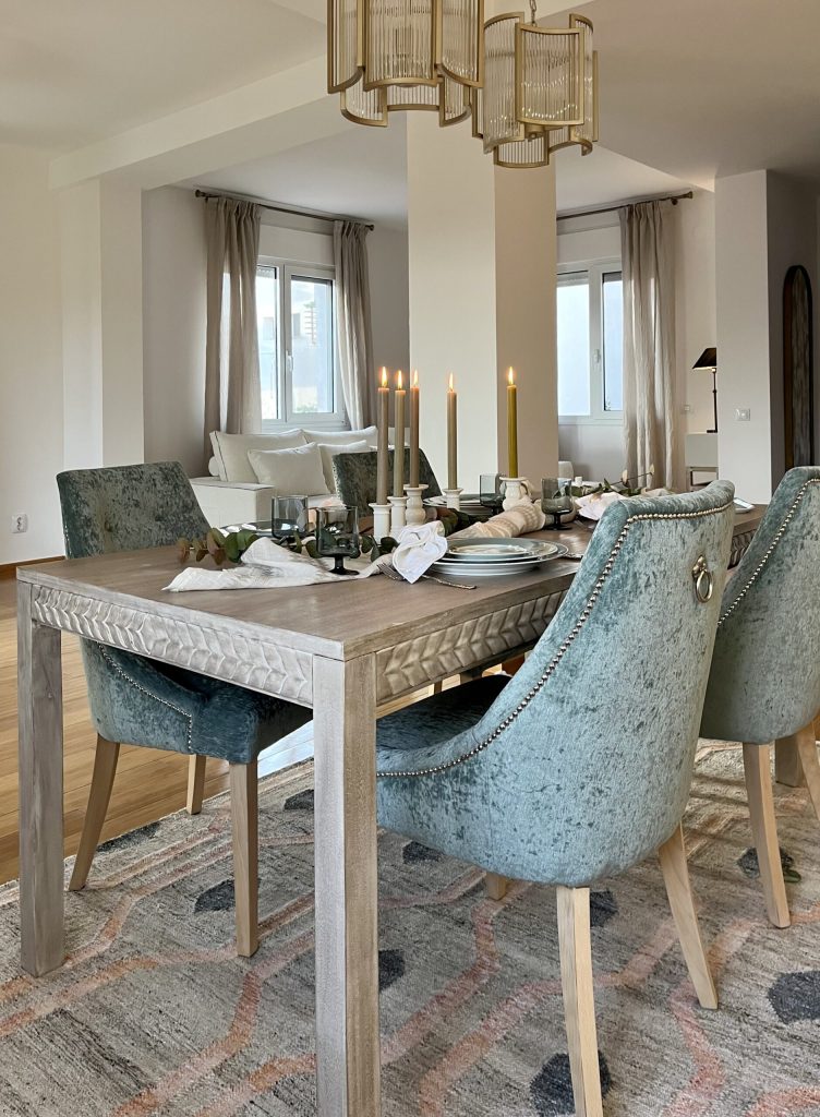 Corina a renunțat la vechea insulă din bucătărie și a înlocuit-o cu o masă sculptată manual. Este o zonă în care a adăugat mai multe elemente prețioase care au schimbat complet înfățișarea parterului. Există multe piese aici care captează atenția, de la scaunele de la Blanc D’Ivoire (colecție mai veche), până la storul din in brodat sau corpurile de iluminat, suspendate deasupra mesei.