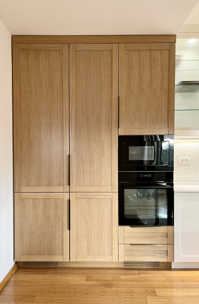 „Iniţial, mobilierul de bucătărie era integrat într-o nişă, aşa cum fusese construită casa, dar ne-am asumat că vom pierde 30 de cm în spatele mobilierului, pe care mi-am dorit să îl aliniez cu corpurile din zona tavanului lăsat”, spune Corina. „Am dat un sens acestui «neajuns», alegând un furnir de lemn şi o formă compactă pentru corpurile aflate sub grinda coborată. Deşi avem dimensiuni diferite ale corpurilor, acestea se conectează firesc cu partea de bucătărie cu corpuri suspendate, dintr-un alt material, având altă culoare”.