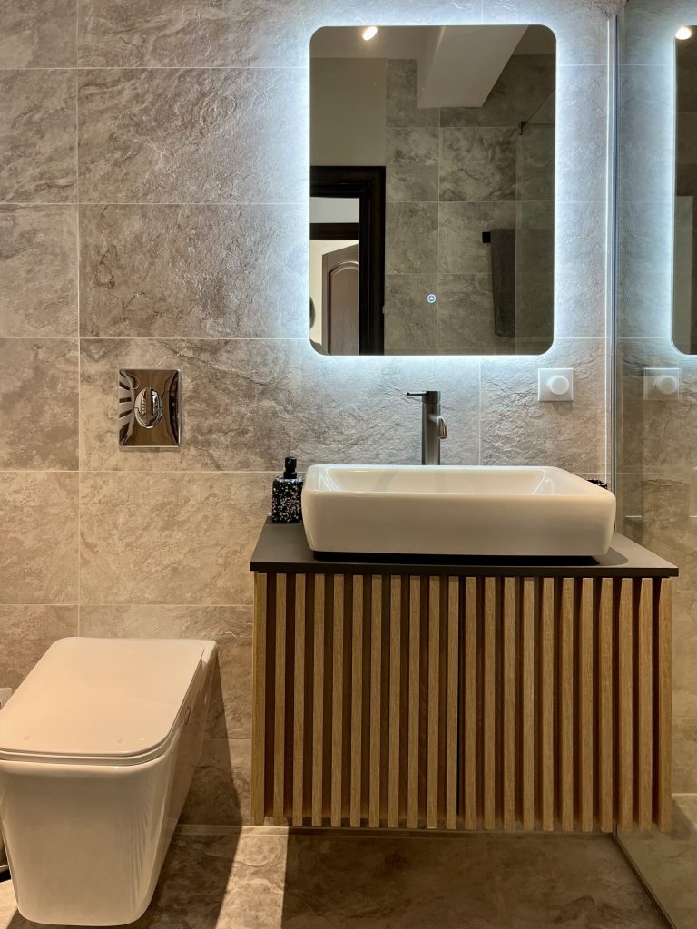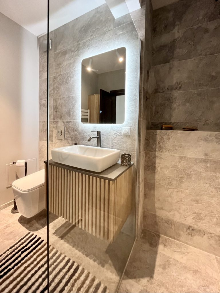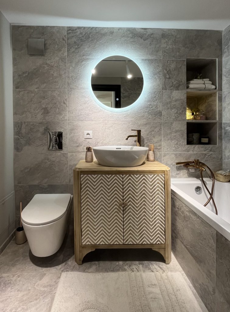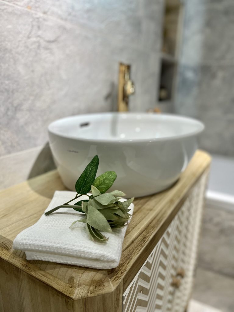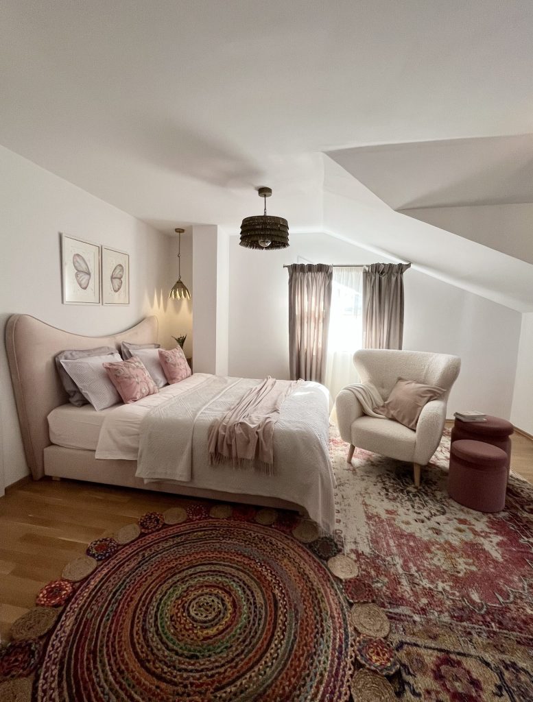 Mansarda este un loc cu totul aparte. Este singura încăpere din casă pentru care Corina a primit un brief minim. Zona este gândită ca un fel de budoar, un spațiu intim și feminin, cu o baie care a fost amenajată ca un private spa. Proiectul a durat mai bine de un an, dar beneficiara s-a mutat după șase luni.