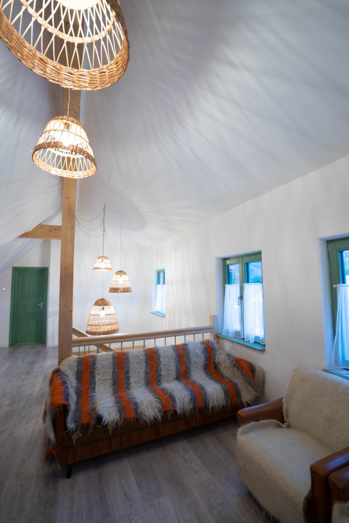 Lavinia a căutat să recreeze atmosfera caldă de casă a bunicii prin soba cu aspect tradițional, finisajele cu lut și var și marginile rotunjite, prin mobilierul de lemn cu sculpturi discrete și tapiseriile din pânză veche de cânepă cusută în casă, scara de lemn, temelia și aleile de grădină făcute cu piatră de râu, cum era odată.