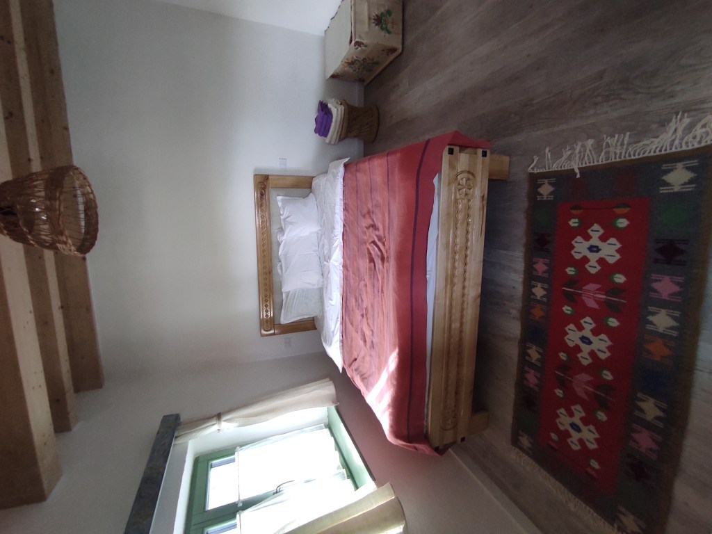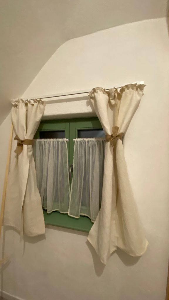 Draperiile de la geamuri sunt, iarăși, o găselniță ingenioasă de-a proprietarilor. Lavinia a cumpărat suluri de pânză de cânepă țesută în casă pentru ștergare tradiționale și a creat din ea tapiseriile paturilor, mici cuverturi și draperiile de la geamurile de la dormitoare. Cânepa este un material pe care bunicii noștri îl foloseau pentru atâtea lucruri. Lavinia ne dă și un pont: pânza de cânepă se face tot mai albă, cu cât stă mai mult la soare, iar în zilele toride respinge căldura.