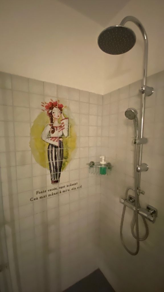 În plus, au printat pe bucățile de faianță câteva desene cu tentă tradițională create de o desenatoare foarte talentată din Cluj Napoca – Cristina Mureșan Toth. Lavinia a completat detaliile de la baie cu coșulețe de nuiele împletite și o chiuvetă de piatră.