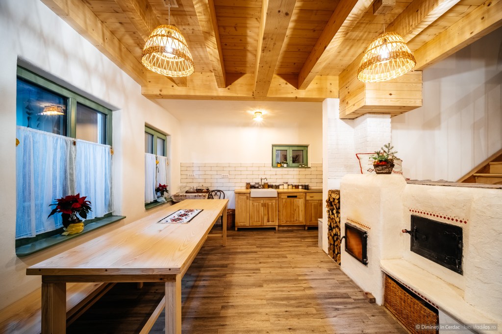 „Odată cu tencuielile, am făcut și soba cu pat încălzit. La fel ca întreaga casă, soba are aspect tradițional, dar este o bijuterie de arhitectură și inginerie. În plus, este și o sobă eficientă – un singur braț de lemne o ține caldă 24 de ore!”, continuă Lavinia. Această sobă străveche este gândită cu aerisire direct din exteriorul casei, ca să nu consume oxigenul din interior, și are coș de fum profesional, foarte bine izolat.