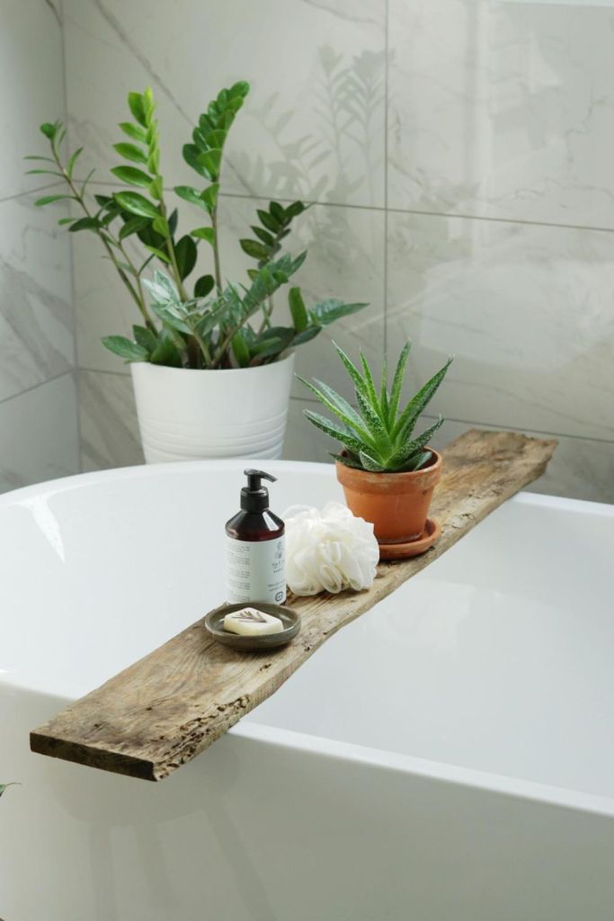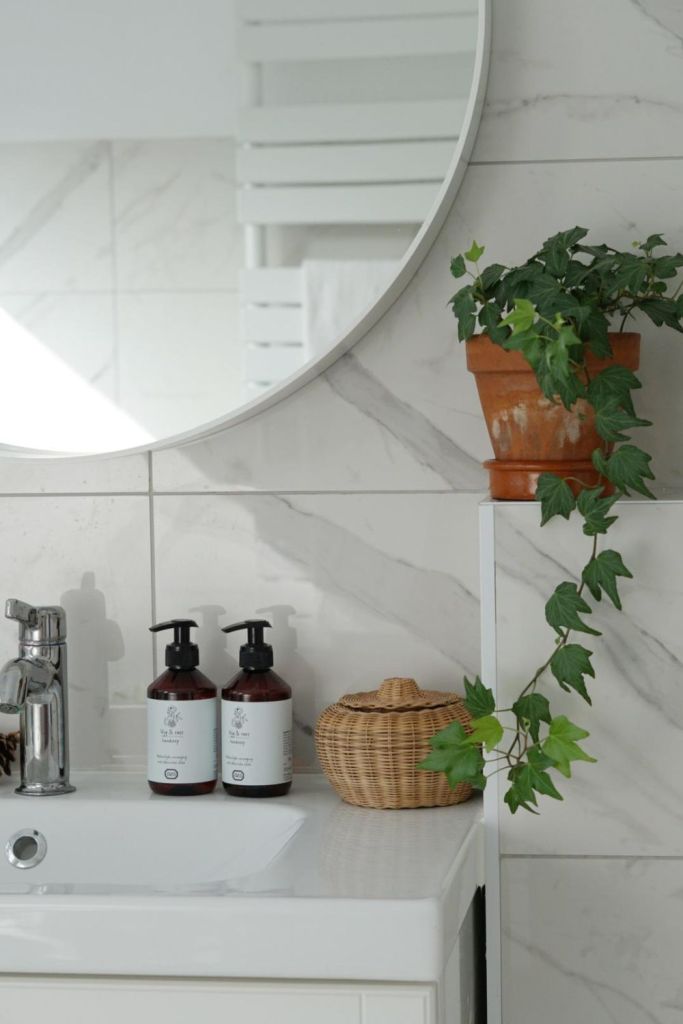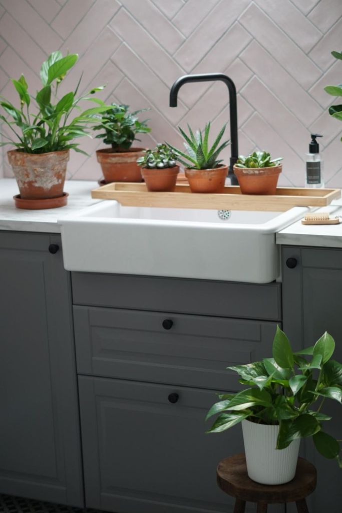 Plantele verzi, în combinație cu mobilierul gri și faianța roz pudrat, oferă un aspect natural încăperii.