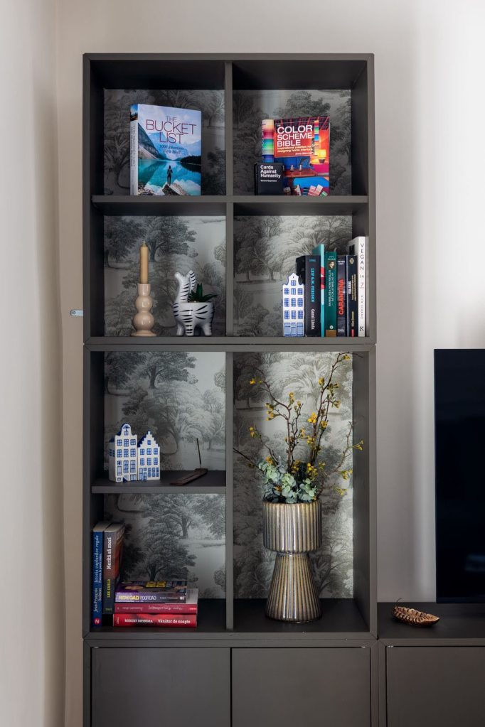 În living au montat un set de mobilă IKEA Eket, pe care l-au vopsit într-o nuanță de brown grey care să aducă un pic de profunzime și caracter încăperii. Pe partea din spate a pieselor a aplicat un tapet asortat cu paleta cromatică a living-ului, astfel încât întreg decorul să se lege într-o poveste coerentă. Canapeaua extensibilă , într-o nuanță plăcută de verde, o masă din lemn masiv de mango, o măsuță de cafea din același material și un fotoliu comod îmbrăcat în imitație de blană de oaie vin să completeze decorul.