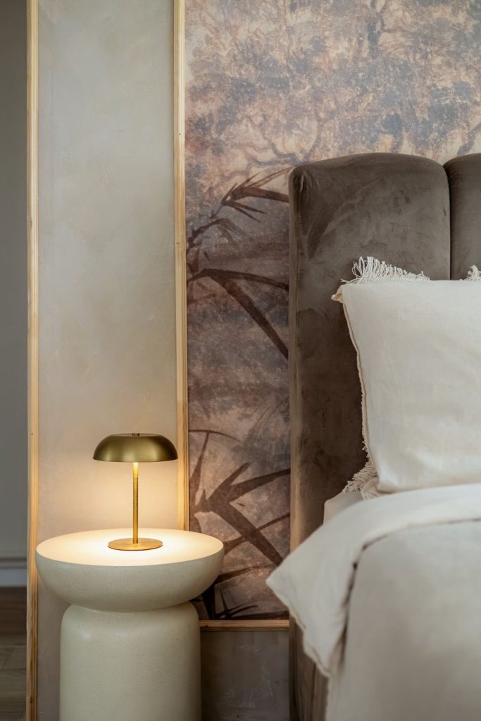 „Soțul meu a ridicat un perete fals, realizat cu plăci de lemn și gips, iar partea vizibilă dinspre cameră am îmbrăcat-o cu un tapet în nuanțe bej-maro, care înfățișează un râu flancat de copaci și păsări”, povestește Alexandra despre modificările aduse dormitorului, care includ și un dreesing pe tot peretele. A integrat în cameră și un birou care poate fi folosit și ca măsuță de machiaj, cât și o oglindă mare, care aduce mai multă luminozitate încăperii. Piesa ei preferată e piedestalul de la Jysk, pe care l-a transformat în noptieră.