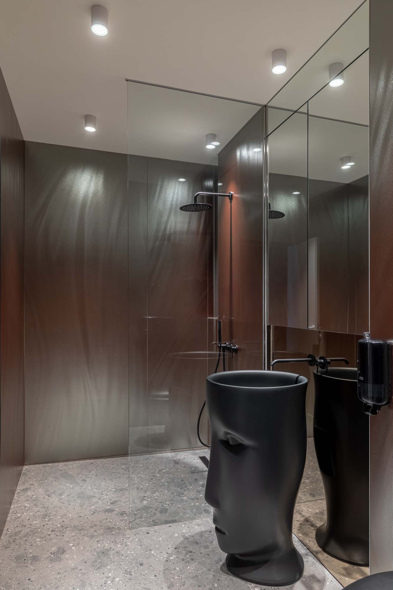 Baia de la parter este un spațiu conceptual, gândit ca un loc „din spatele cortinei”. Plăcile ceramice cu falduri și lavoarul sculptural transformă spațiul într-unul teatral.