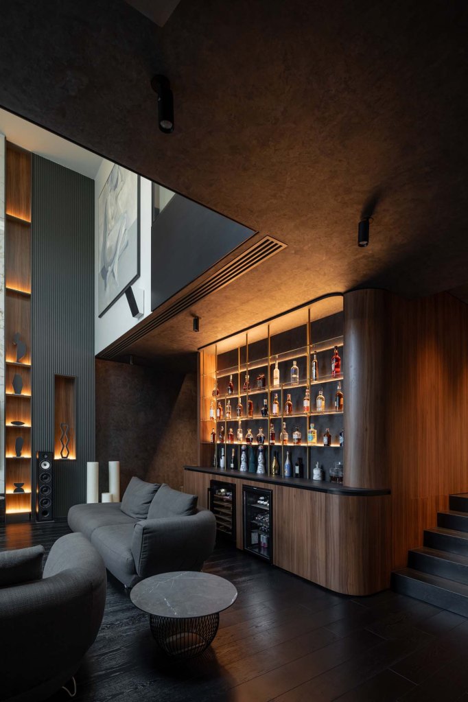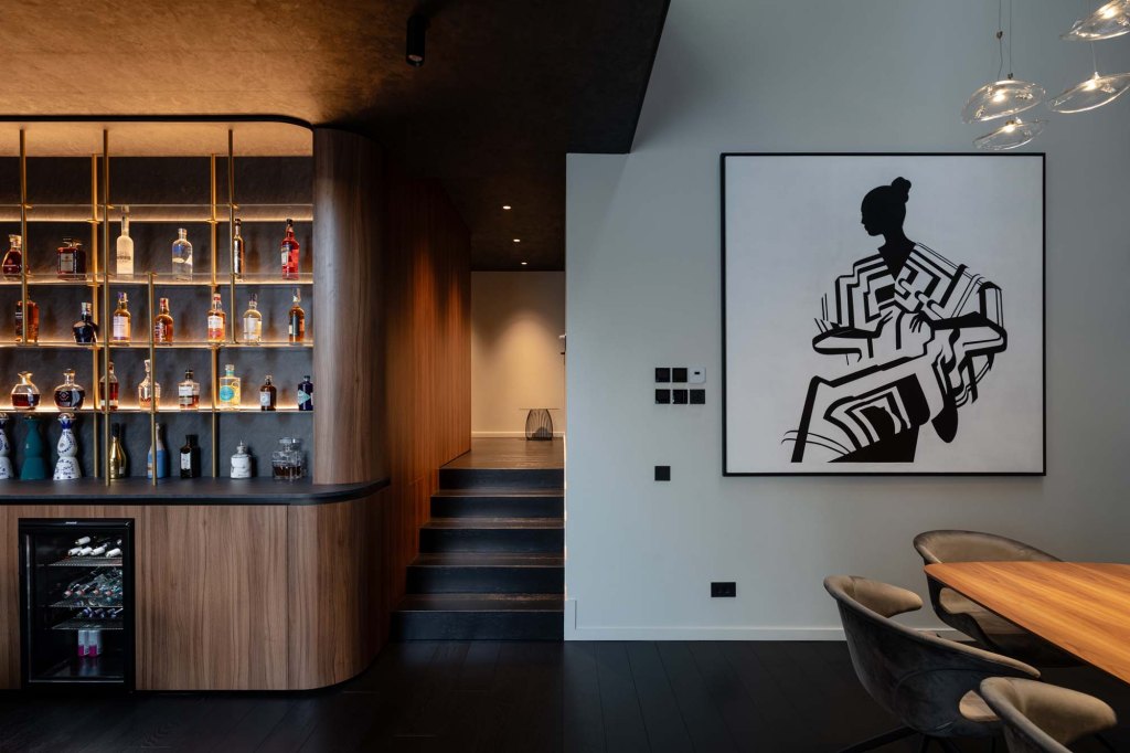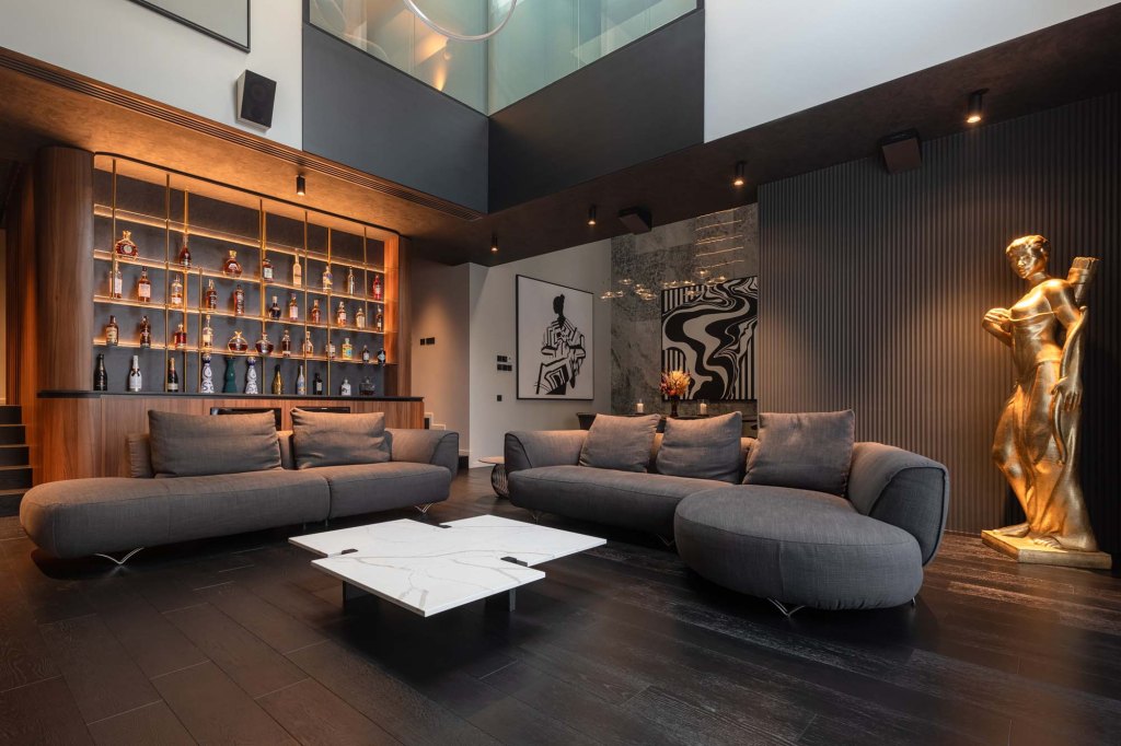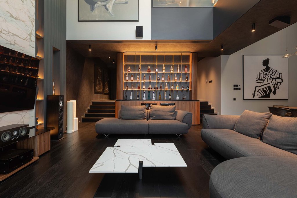Culorile predominante pentru camera de zi sunt tonuri închise – negru, gri și accente de auriu, care oferă un aspect elegant și rafinat. Biblioteca de pe perete cu băuturi fine, iluminată discret, cu rafturi din lemn și elemente metalice aurii, completează atmosfera elegantă pe care și-a dorit-o proprietarul.