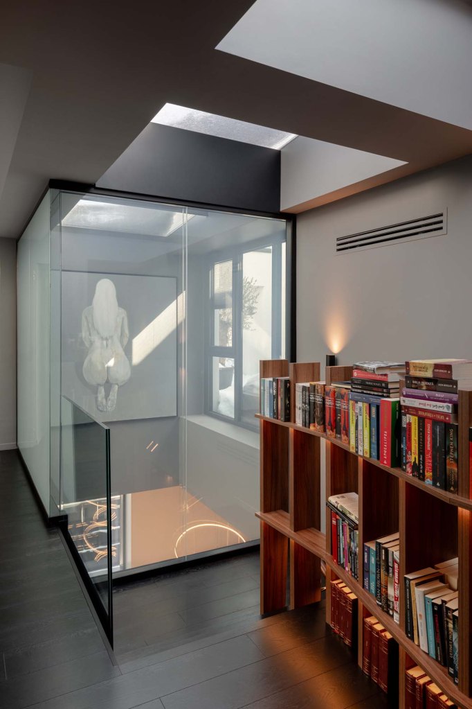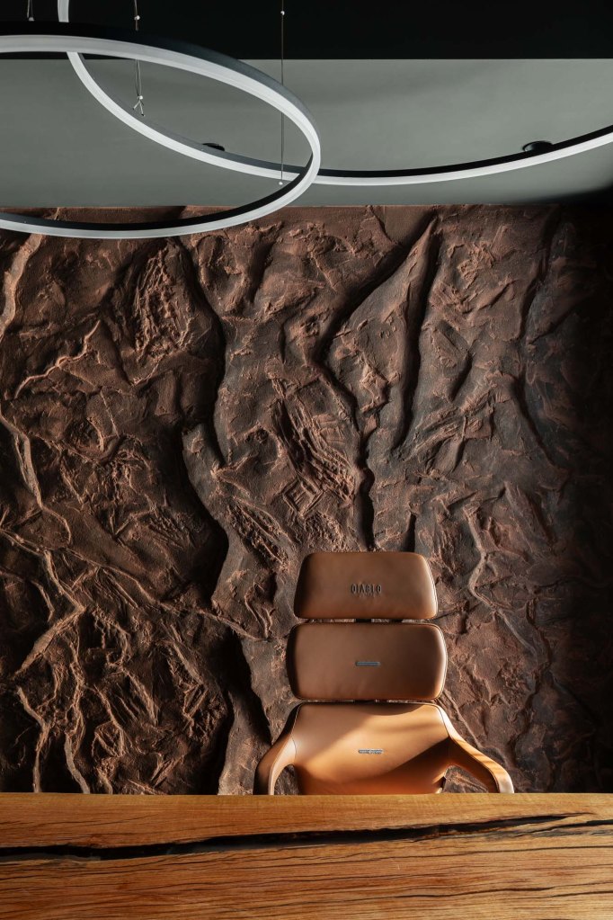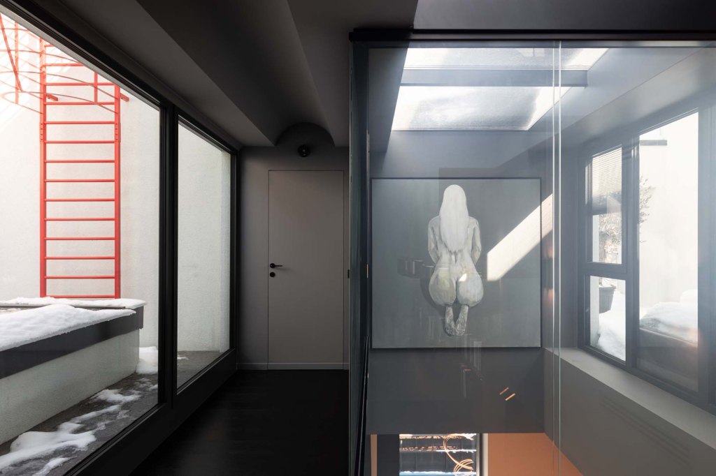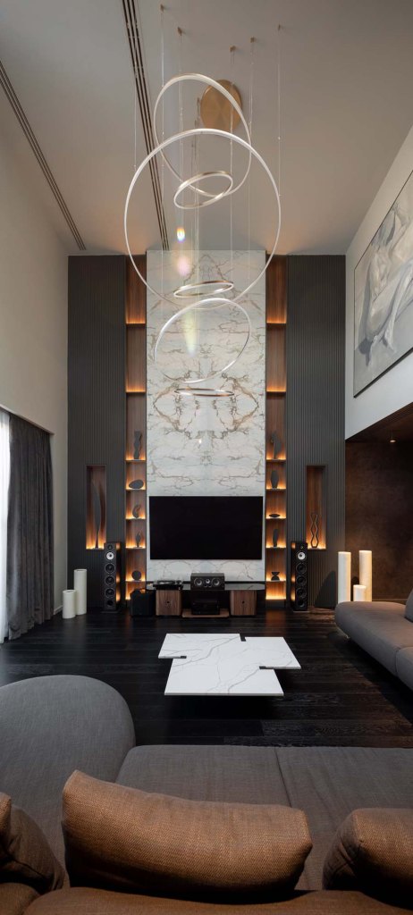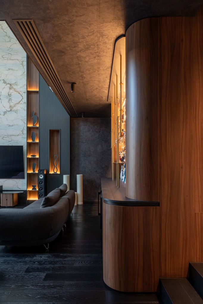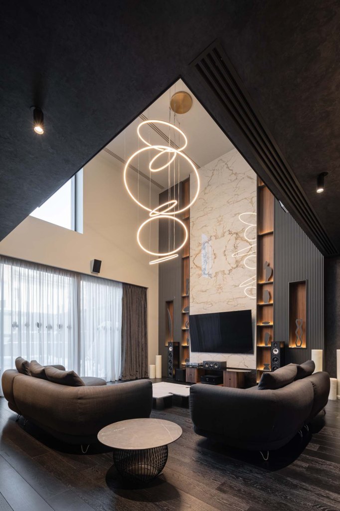 Echipa de arhitecți a gândit fiecare detaliu astfel încât să creeze contraste dramatice. Pe peretele de accent din living, de exemplu, înalt cât întreaga încăpere, lumina joacă un rol esențial în crearea unui astfel de contract. Apoi, statuia aurie a zeiței Diana iese în evidență pe un fundal negru. A fost o provocare să găsească un artist care să poată realiza această statuetă.